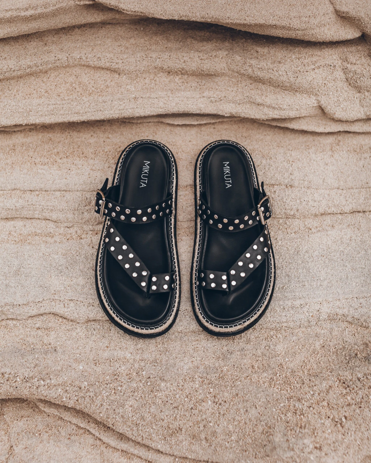Somewhere in between our strappy sandals and our laced espadrilles lies The Black Chunky Sandals. The espadrilles style layer combined with our thick 100% cow leather stack creates a higher than usual platform sole while the sandal straps are adorned with silver metal studs and toe loop detail.