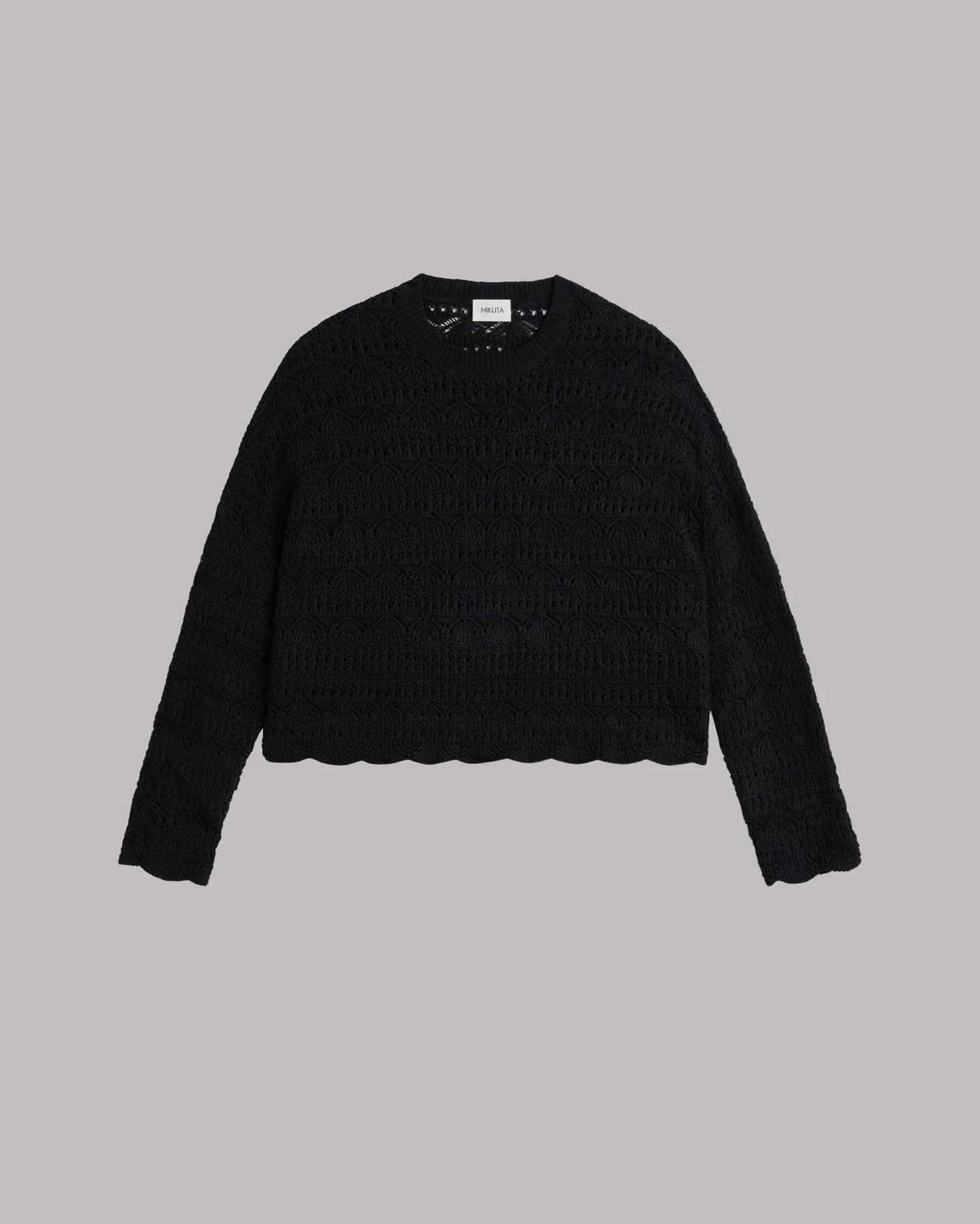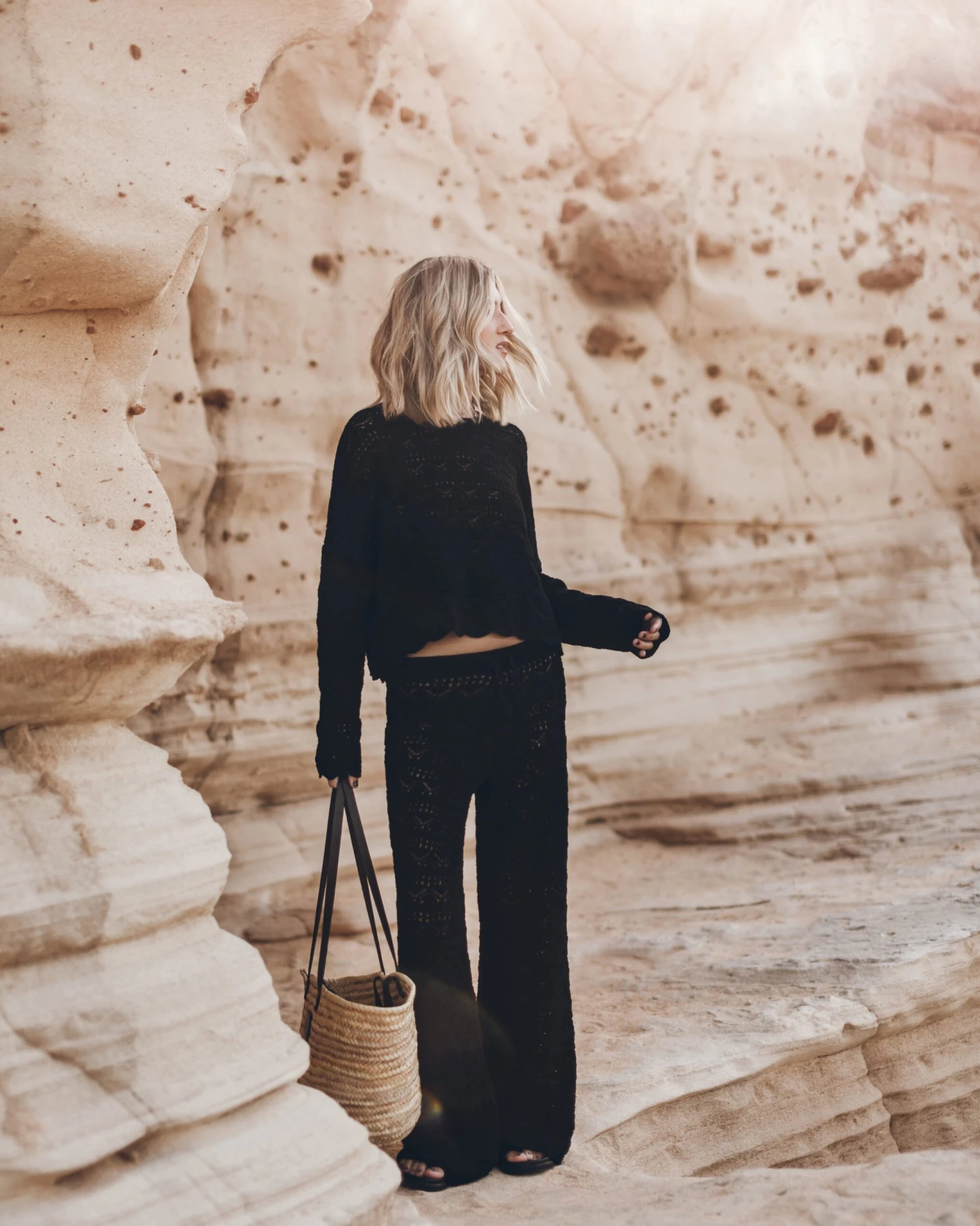 Enter bohemian bliss with our nostalgic and timeless crochet sweater. Crafted in a thick, breathable linen blend, the black crochet sweater can go everywhere with you, perfect for layering over your favorite swimsuit or dressing up with strappy sandals for an evening out. The hook crochet detailing adds a touch of artisanal charm while still allowing for extra skin contact with the elements.
