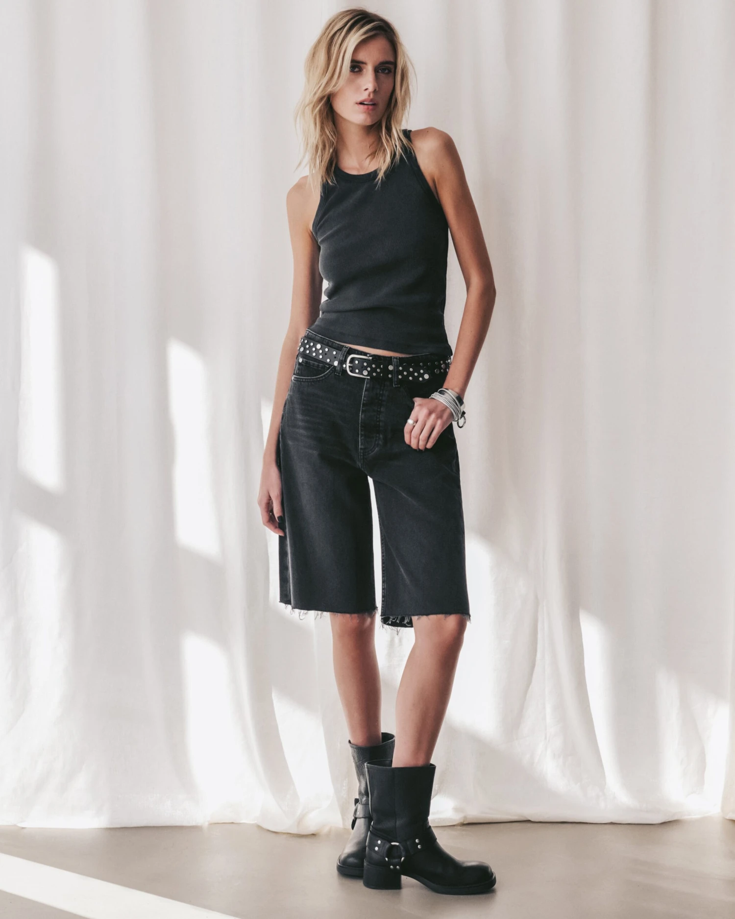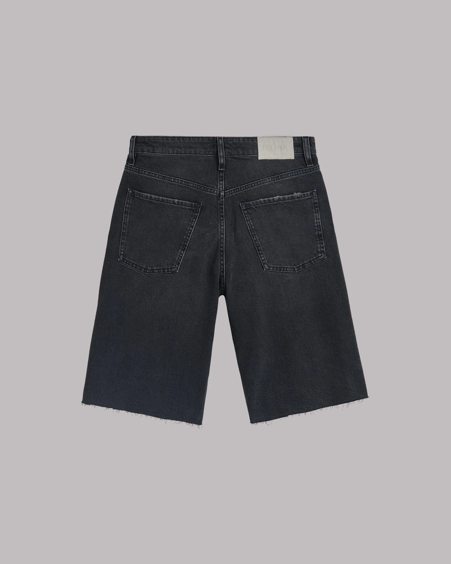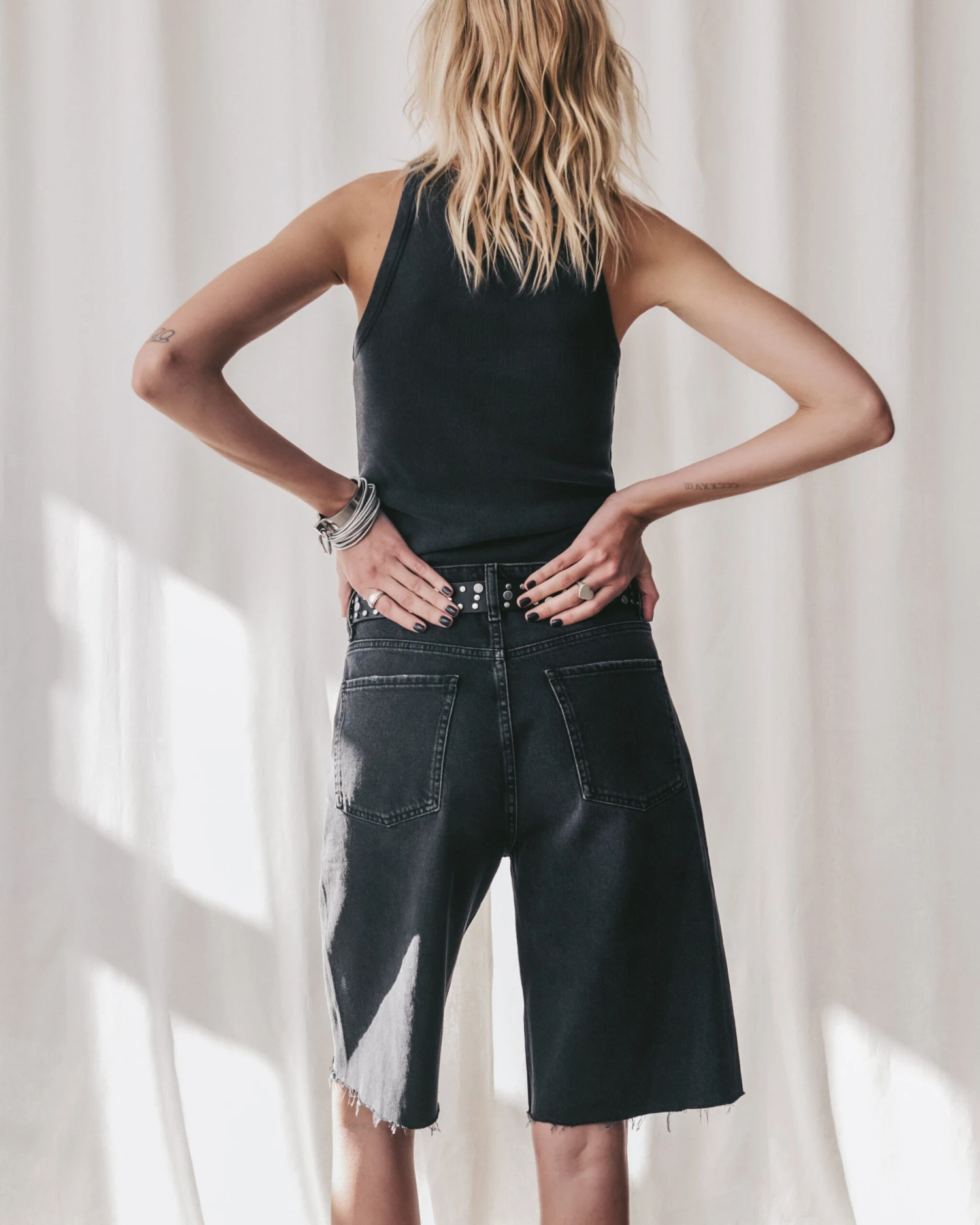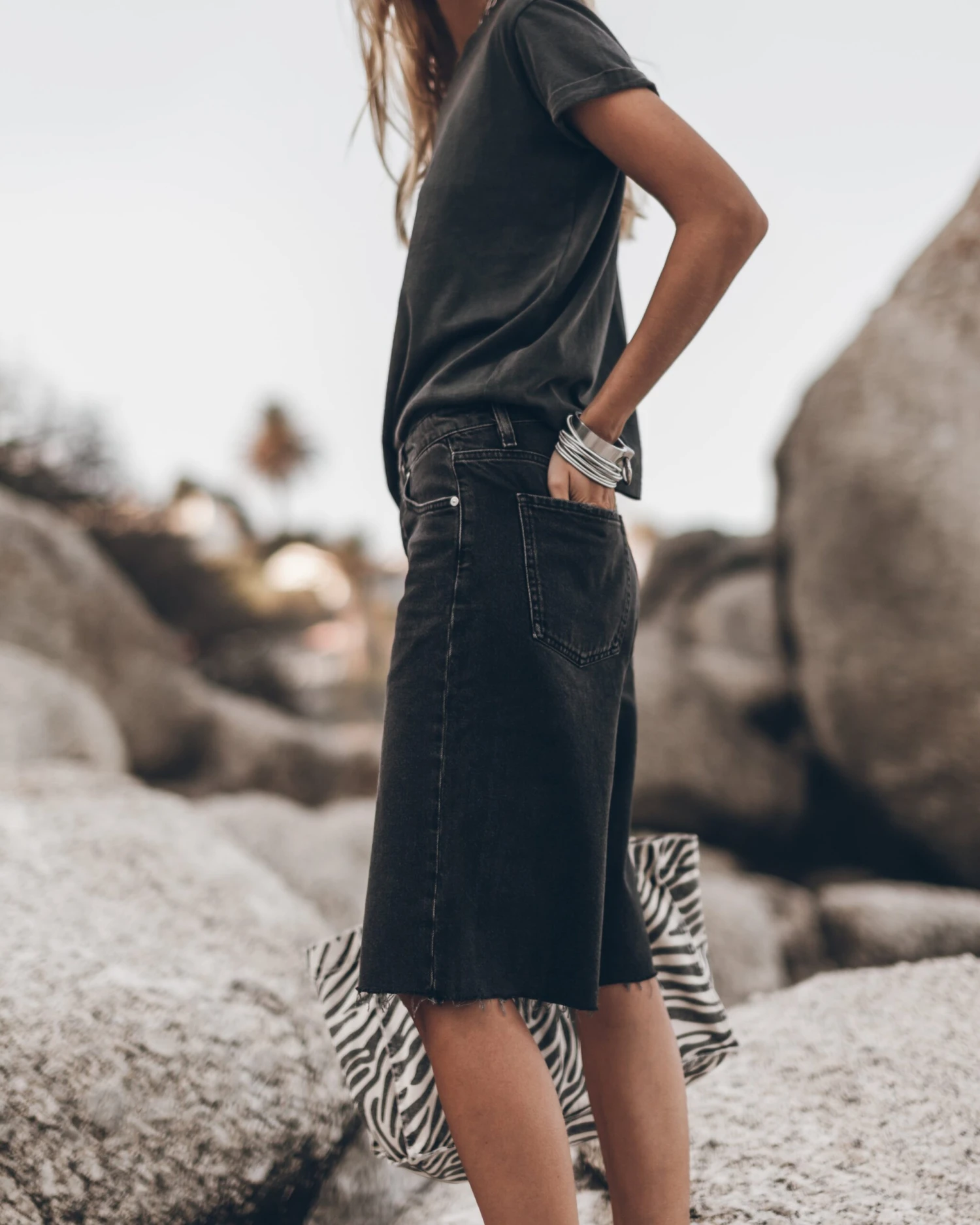 The Black Denim Bermuda Shorts are mid-rise and have a relaxed, slightly oversized fit that falls just above the knee. The raw hem adds that undone, just the way we like it.