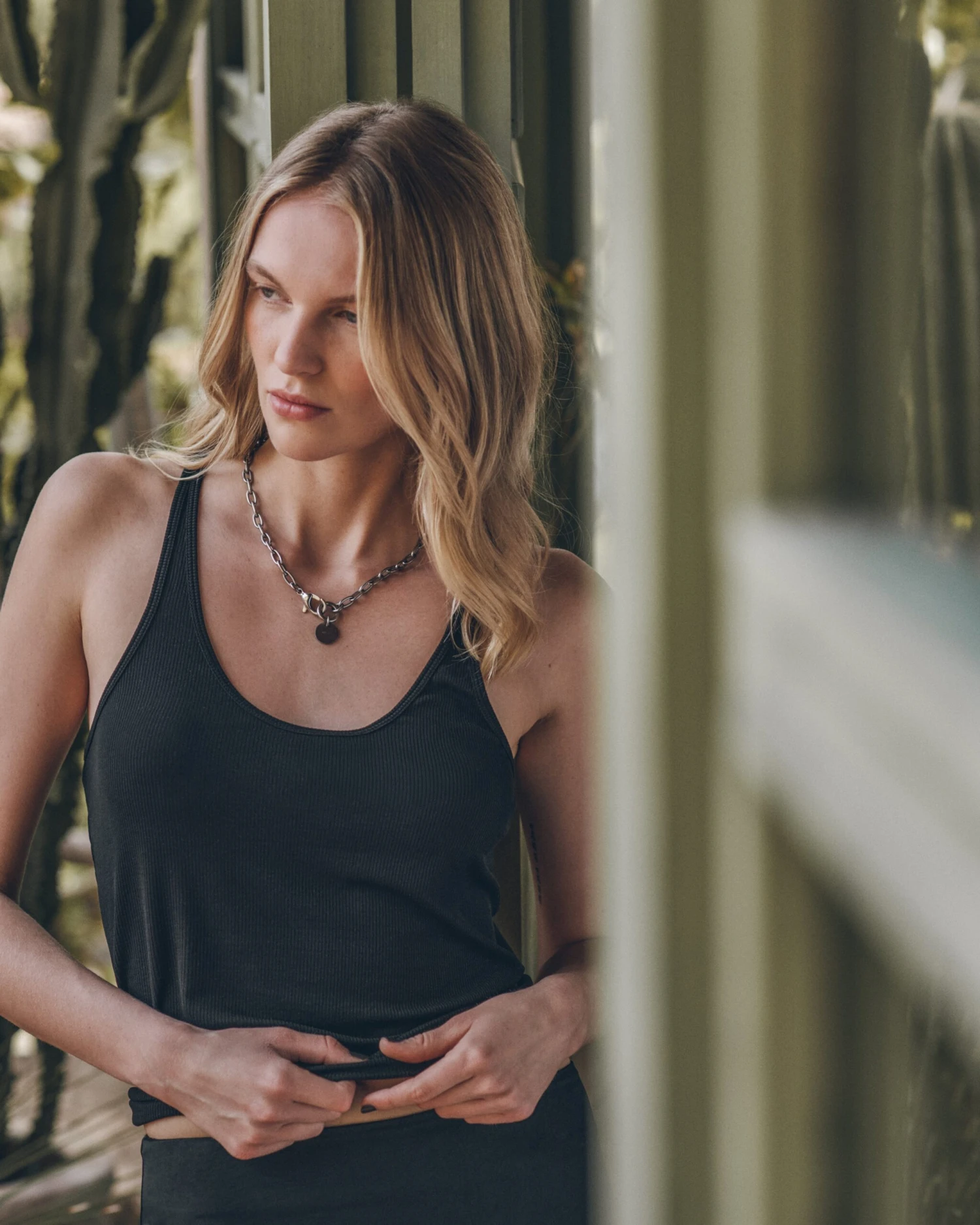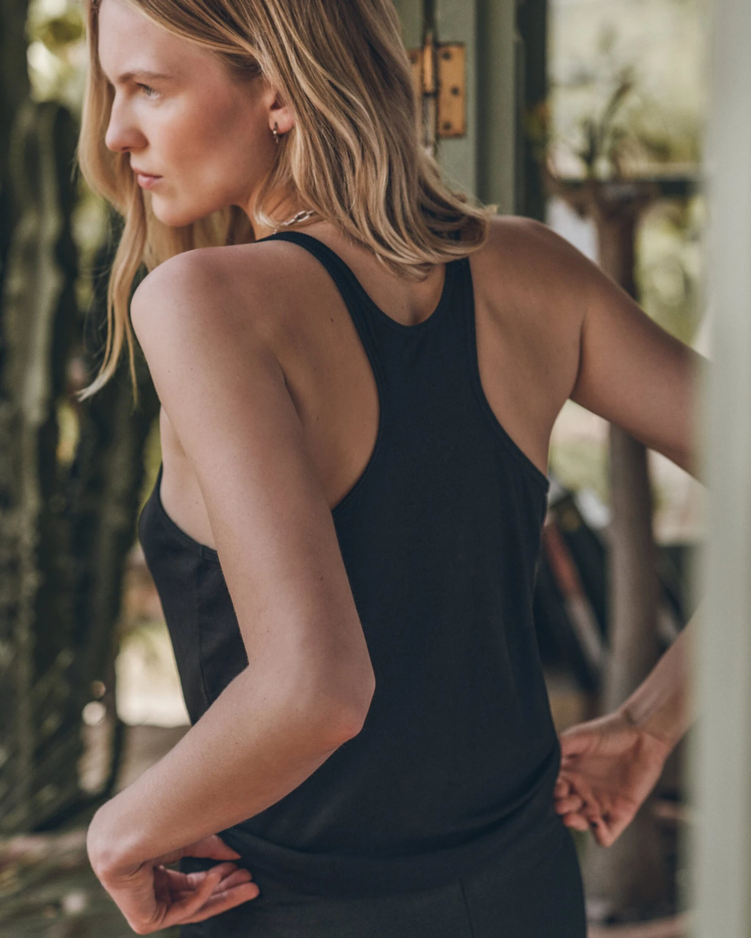 The Black Fine Tank Top hugs the body without clinging too tight, and is made from a majority lyocell fabric, providing softness, comfort, and breathability in any temperature. The delicate racerback and crew neckline are typical of most tanks, but our unique fabric blend and dying process add a little something special to this elevated basic.