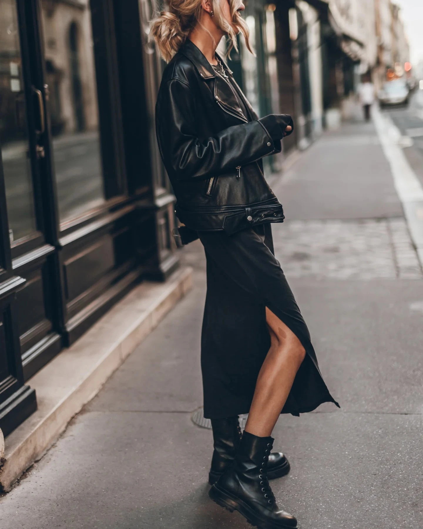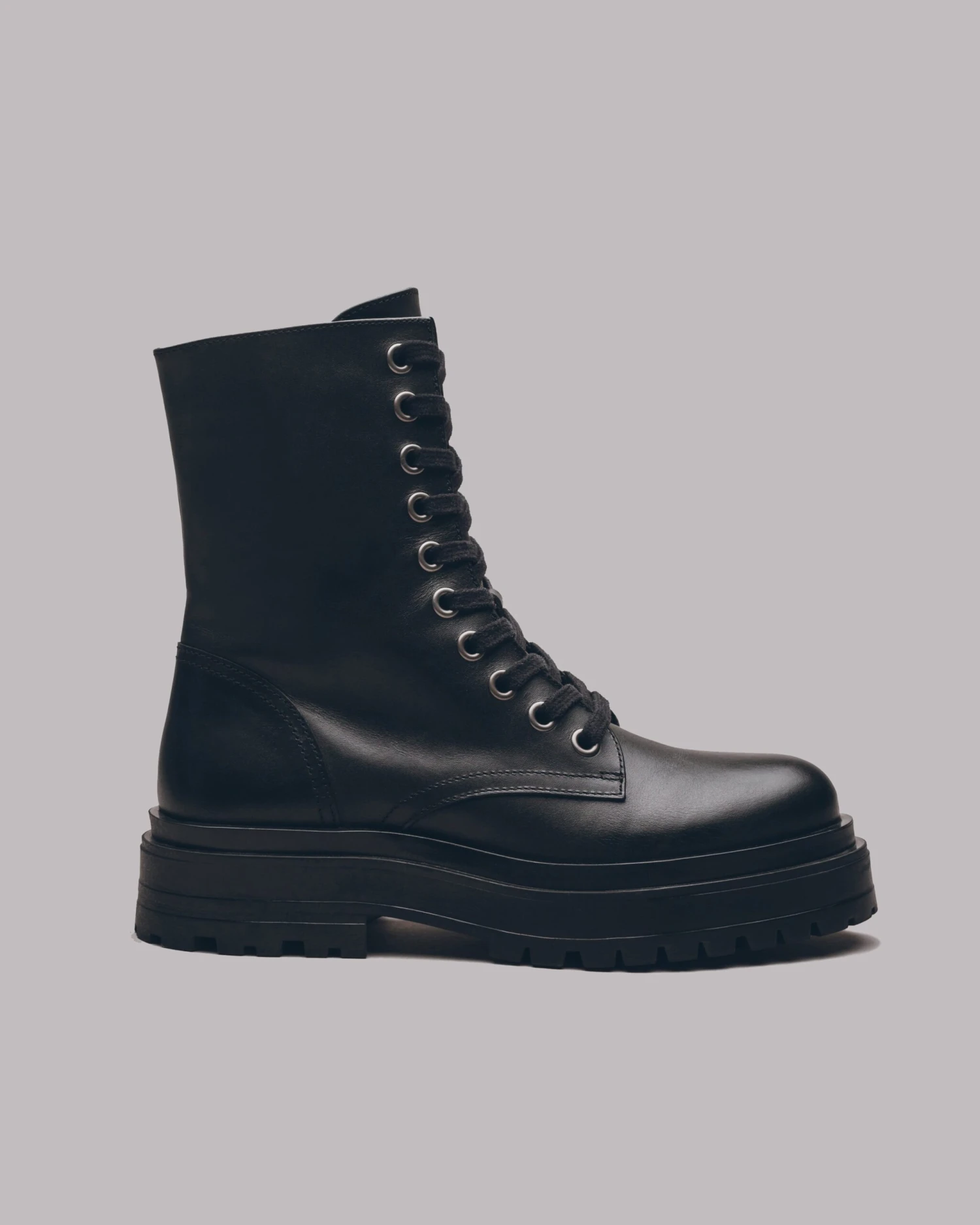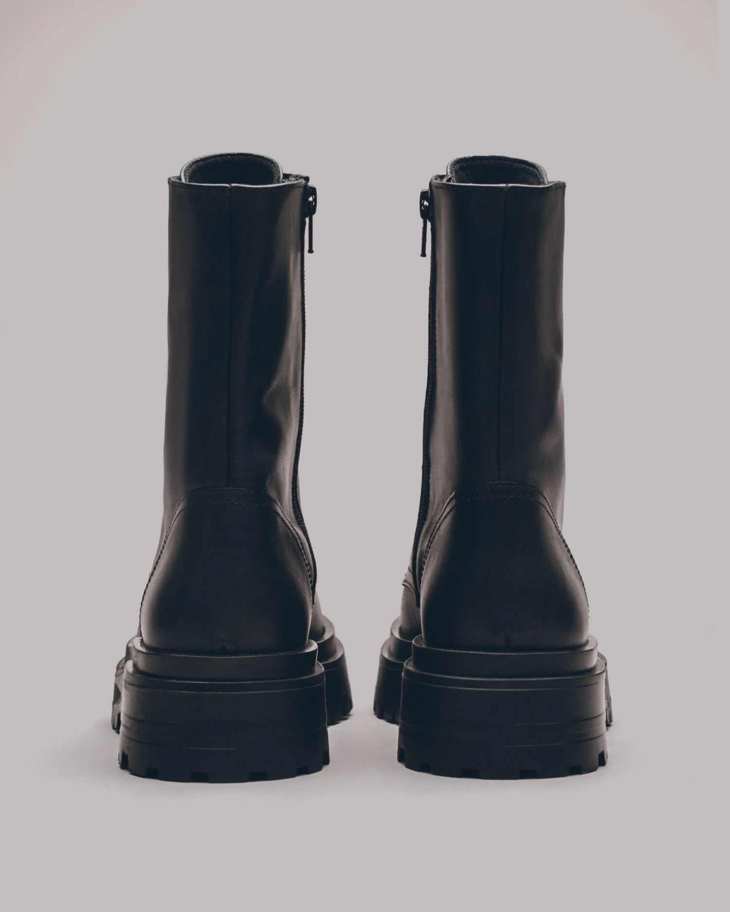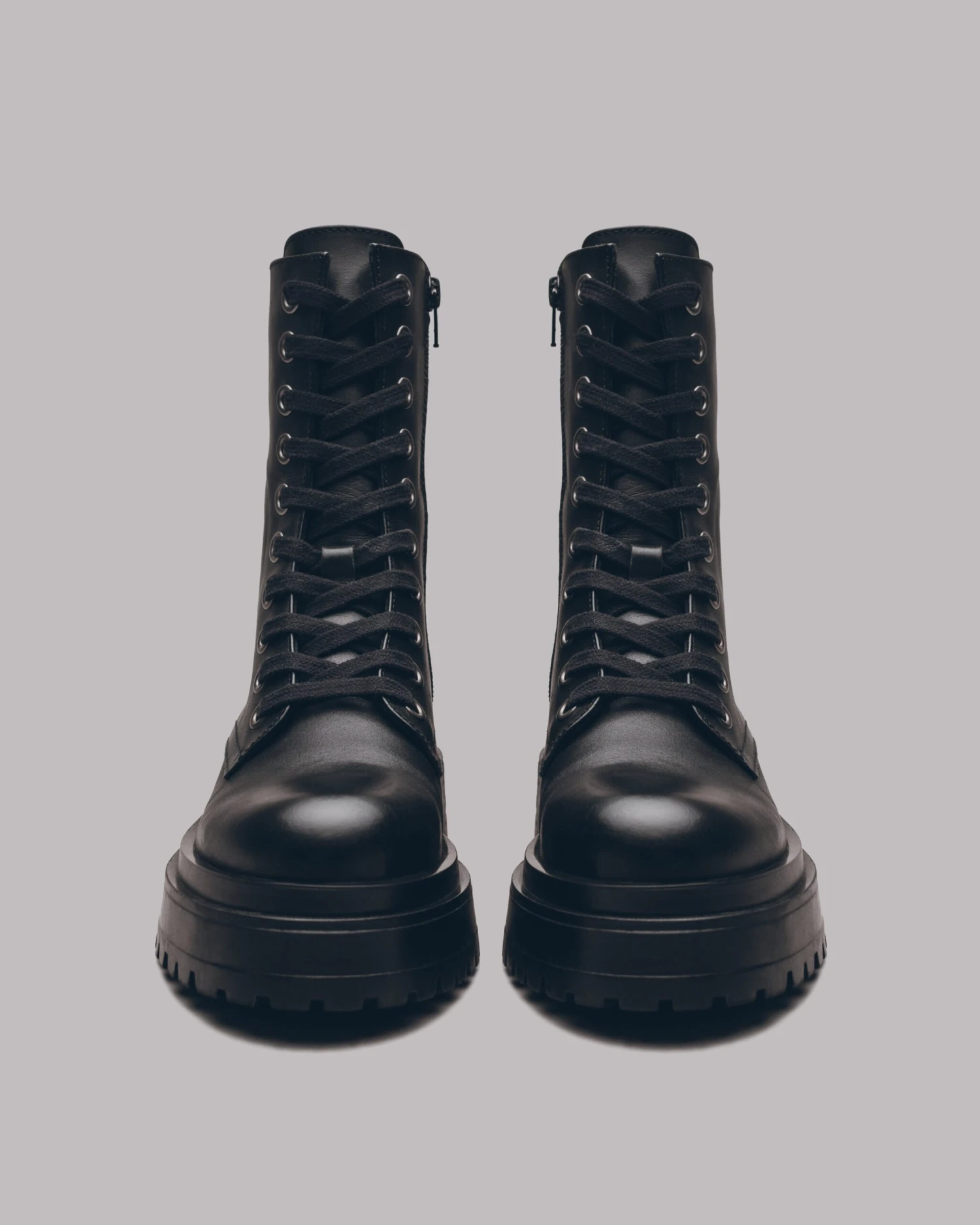 Black laced boots with a zipper on the side. Gunmetal hardware and platform sole.