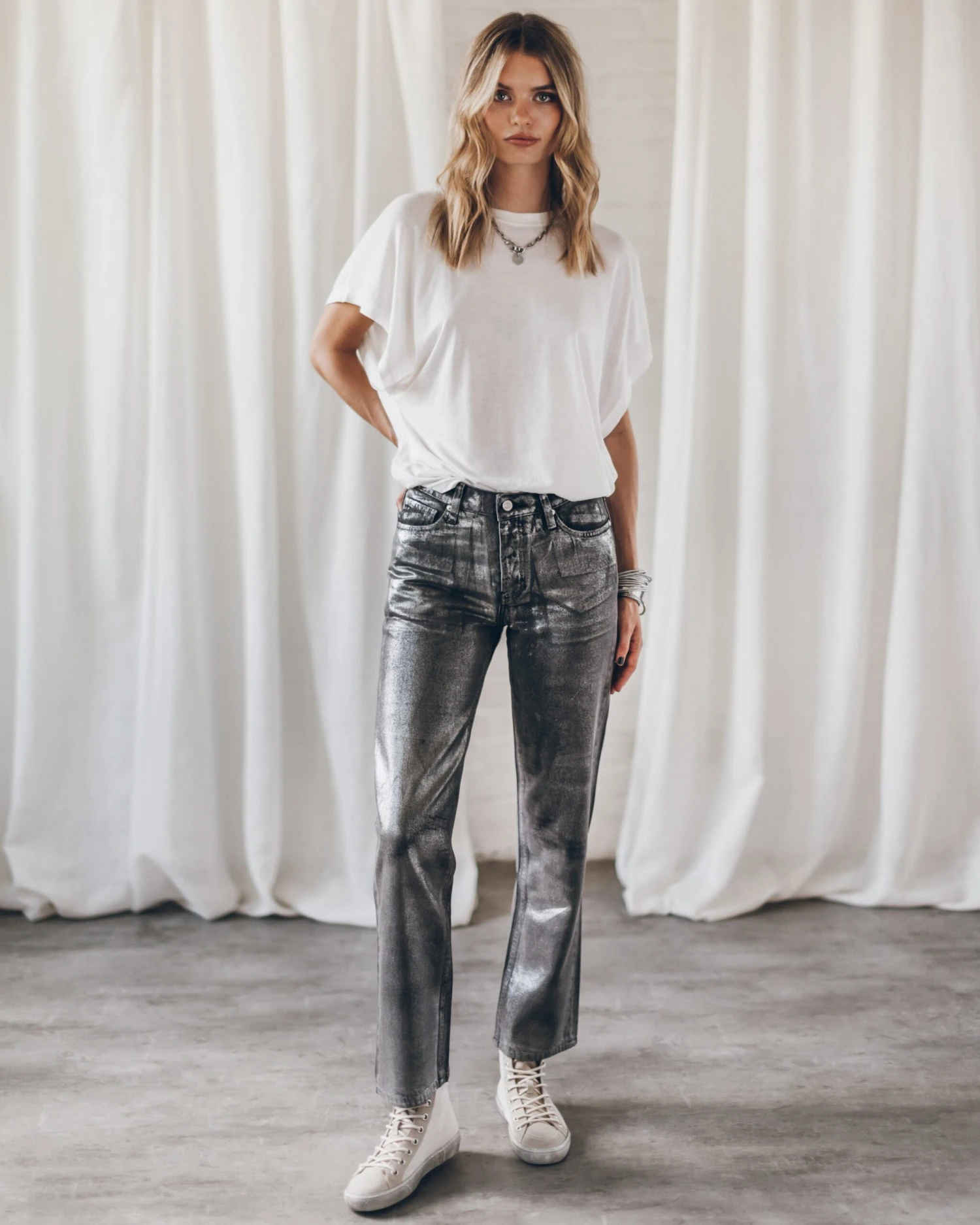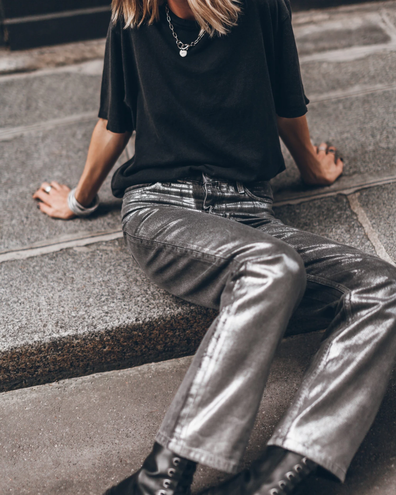 The Black Shimmer Straight Jeans are long and non-stretchy in faded wash with silver coating. They have a mid-rise and come with back- and front-pockets and summary closure.