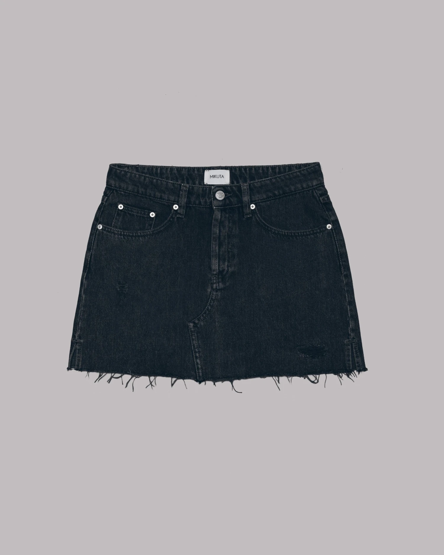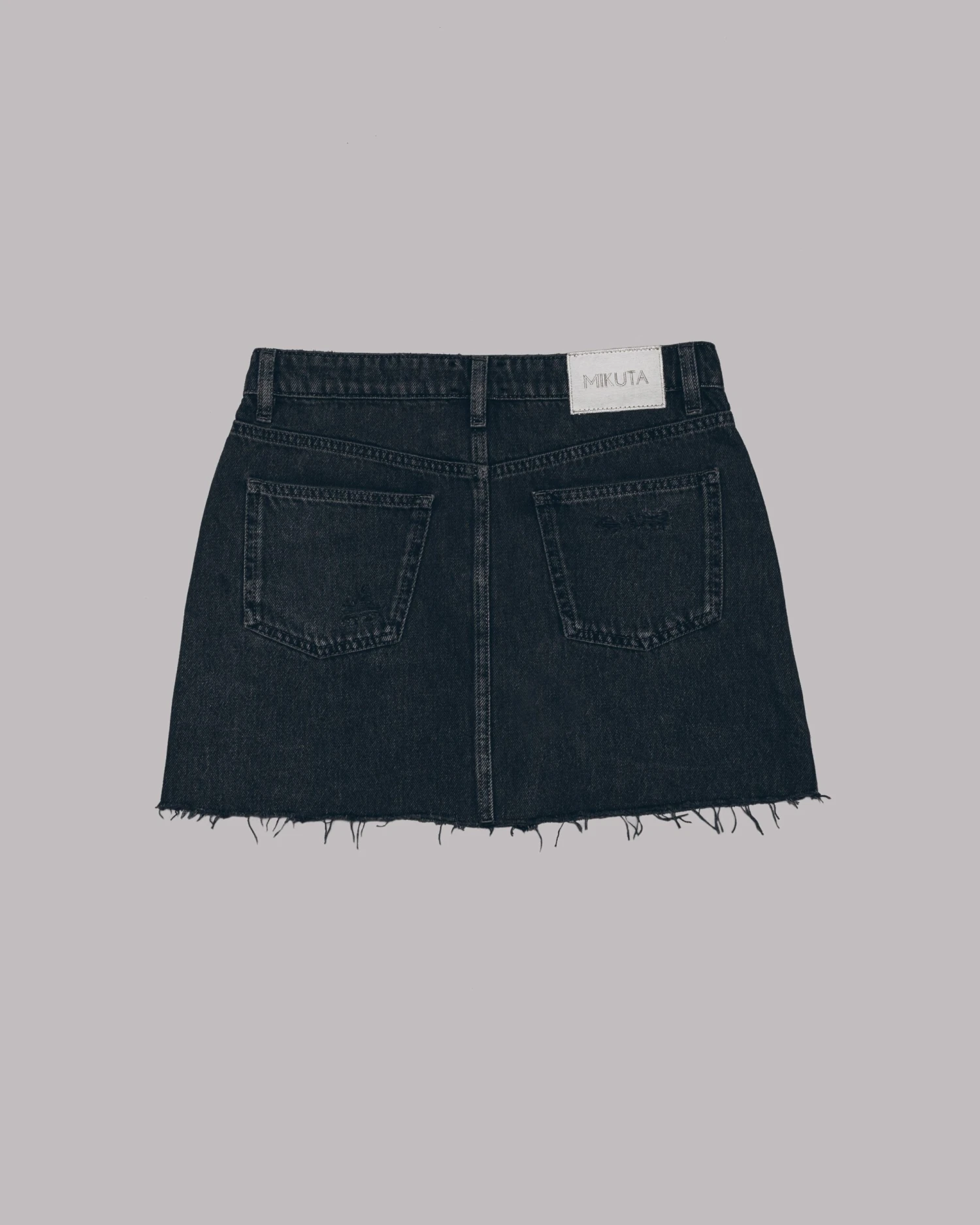 Black washed denim skirt with raw hem, ripped details and small slits on the sides. Has two pockets in the front and two in the back.