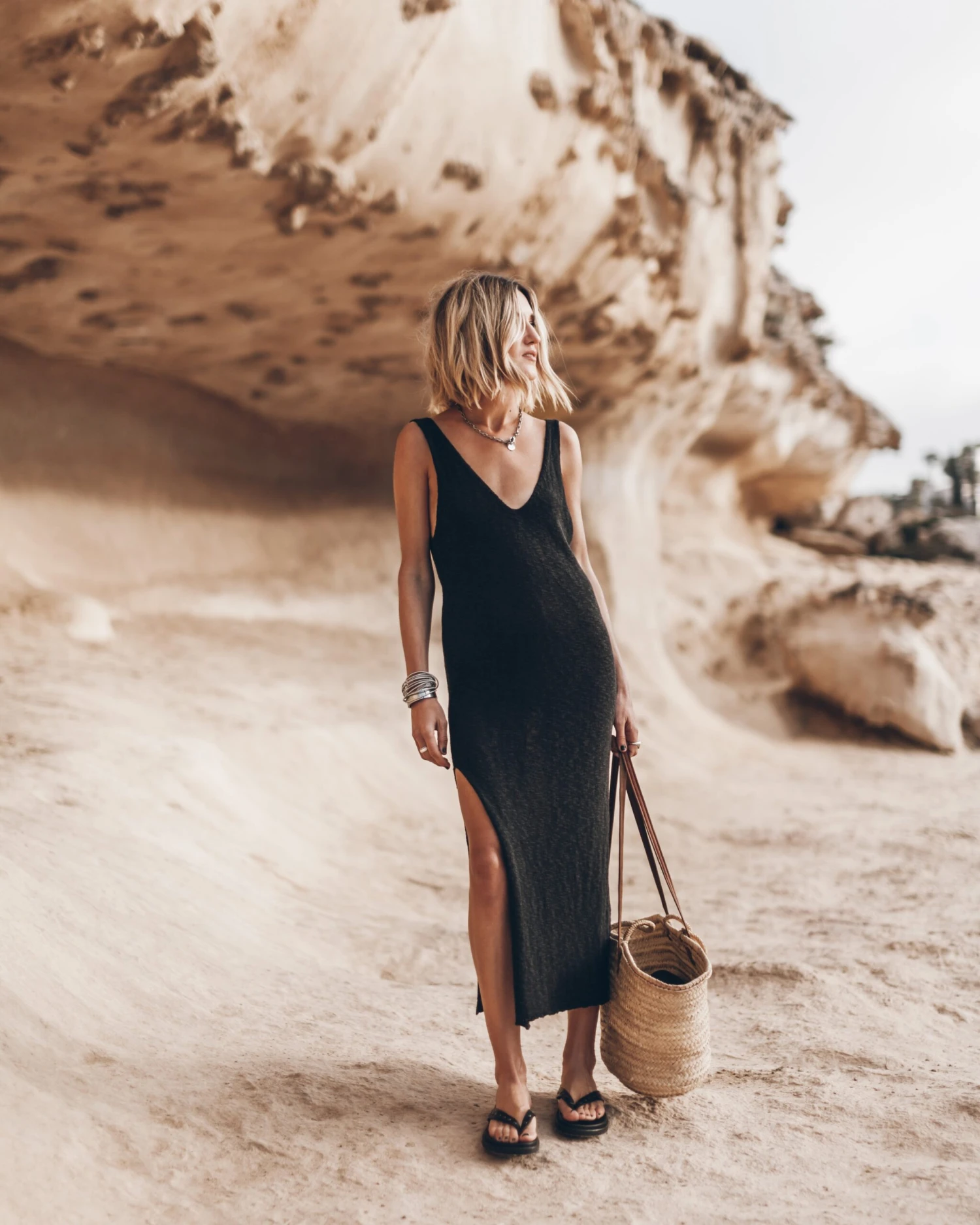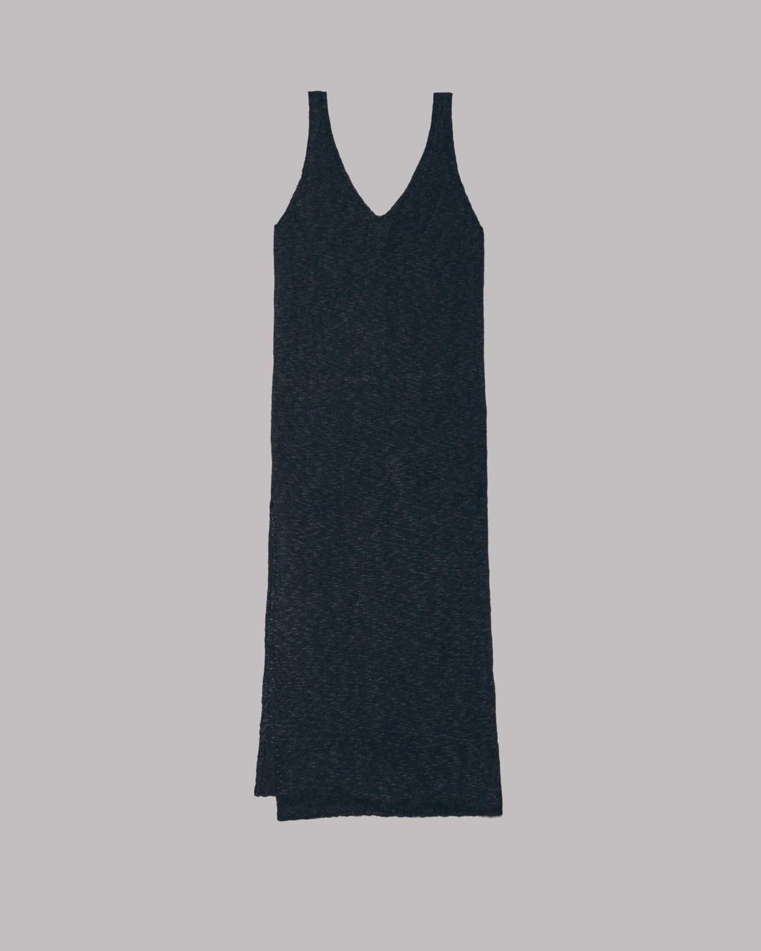 Black long dress in cotton and linen mix with a slit on the side.