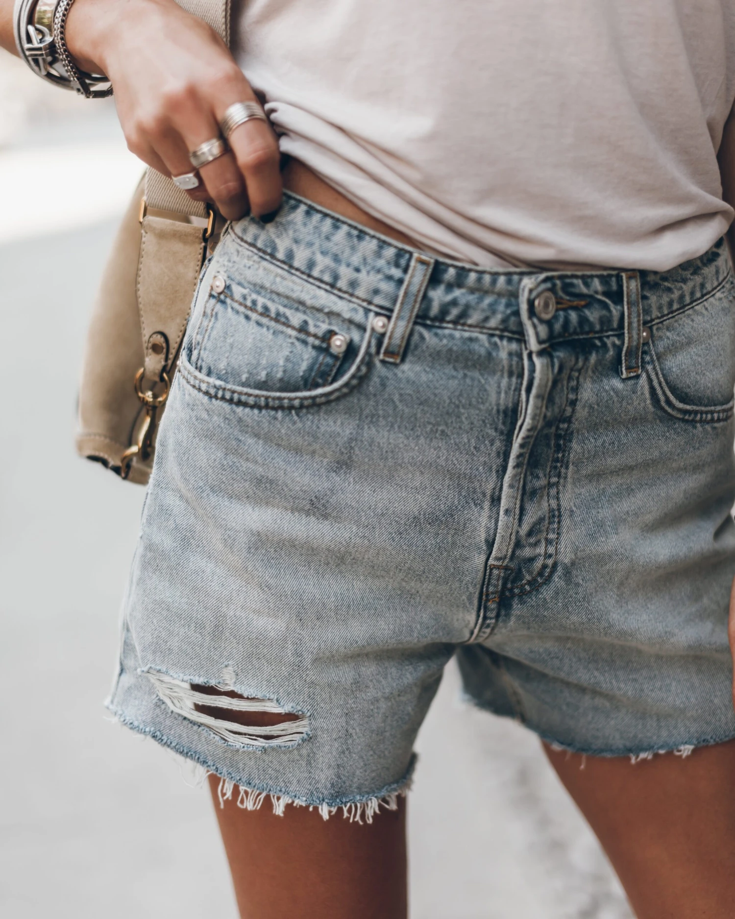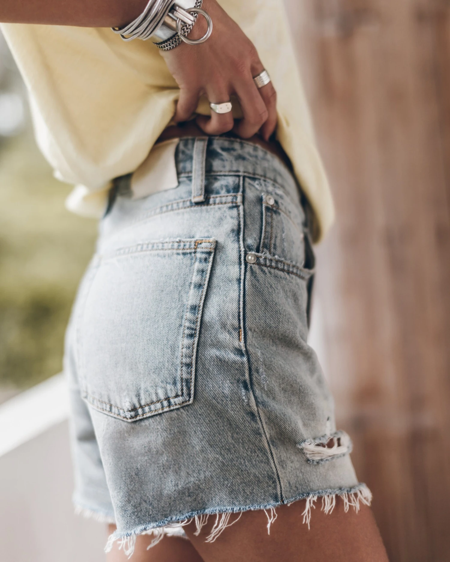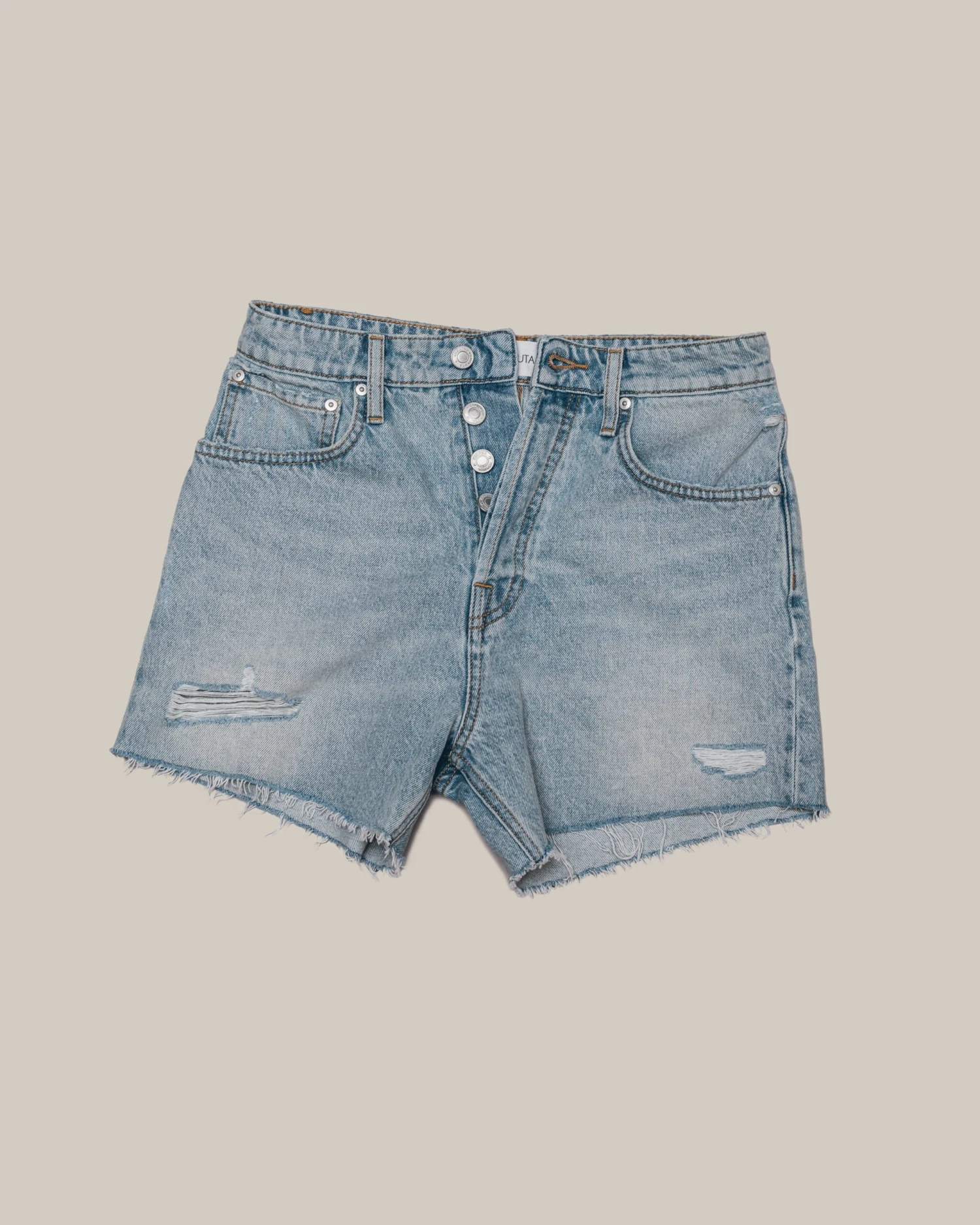 Non-stretchy, vintage inspired mid-rise denim shorts with summary closure.