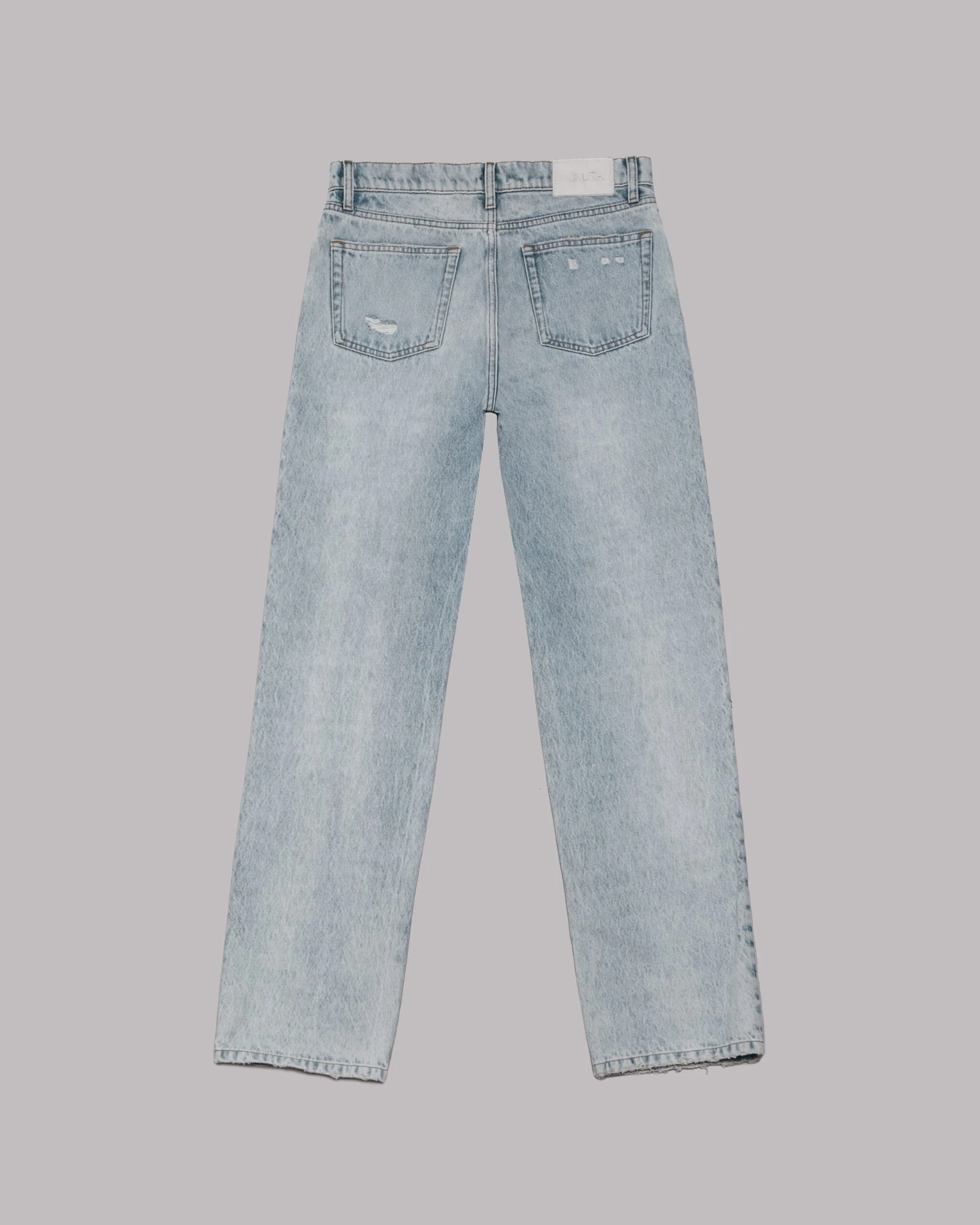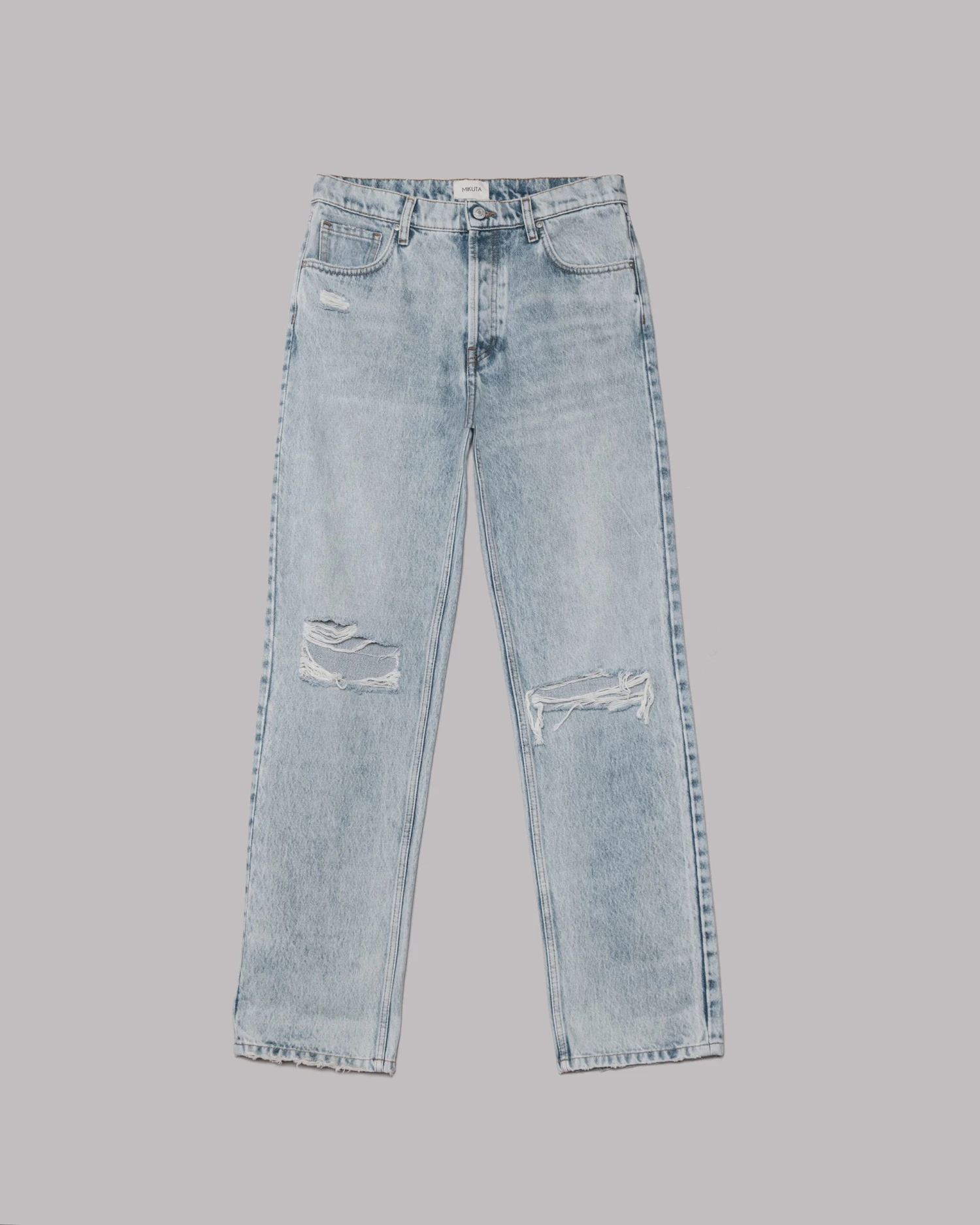 The Blue Ripped Relaxed Jeans are non-stretchy in faded light blue with distressed knees. They are mid-rise and have back- and front-pockets and summaryed closure.
