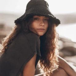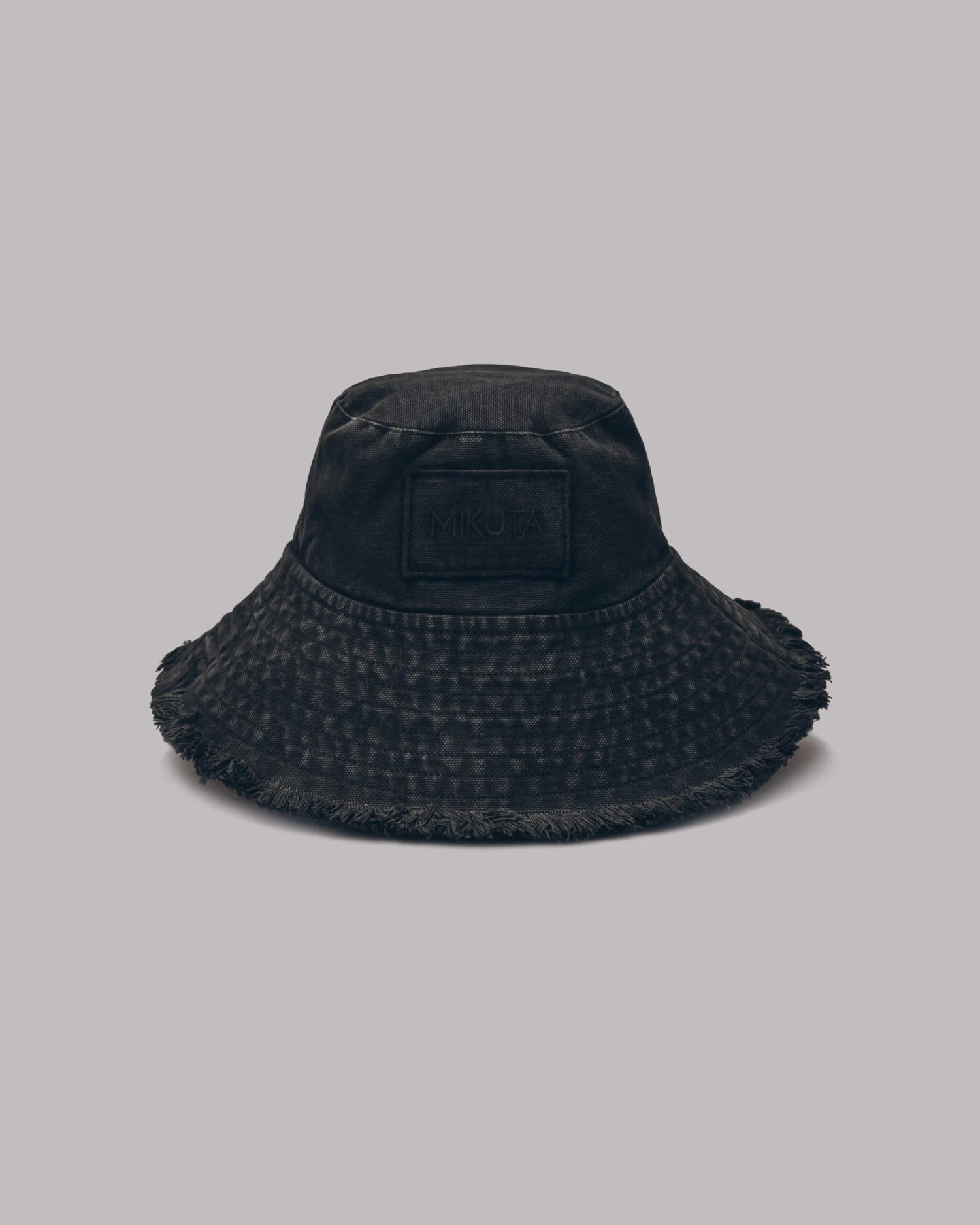 Bucket hat in faded black with raw edges and a MIKUTA patch on the front.