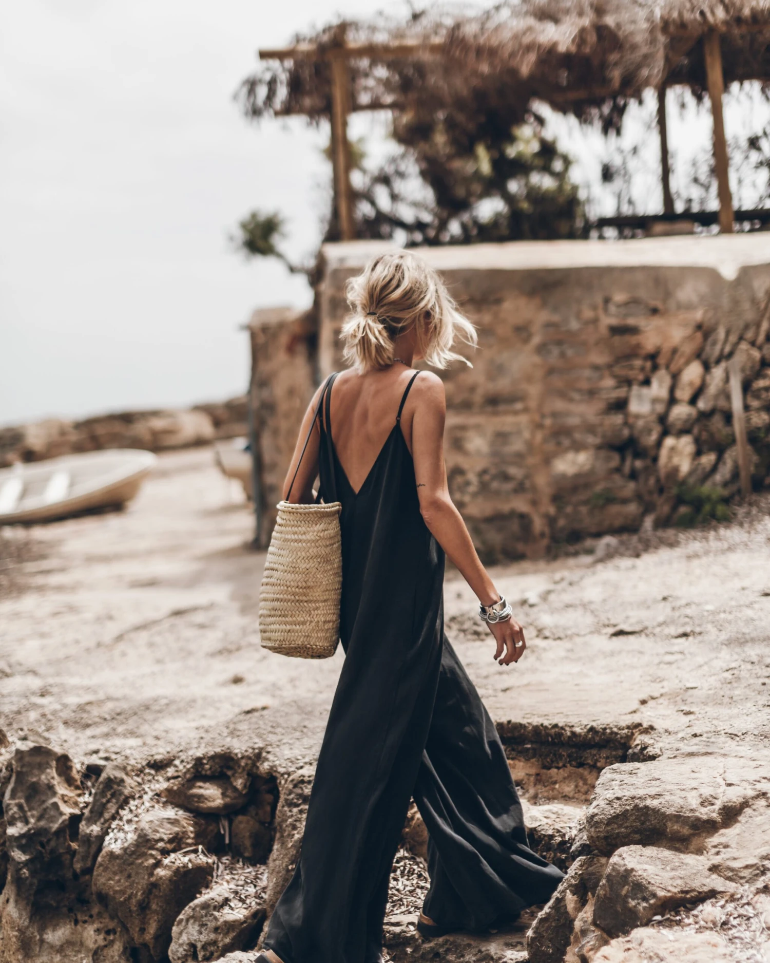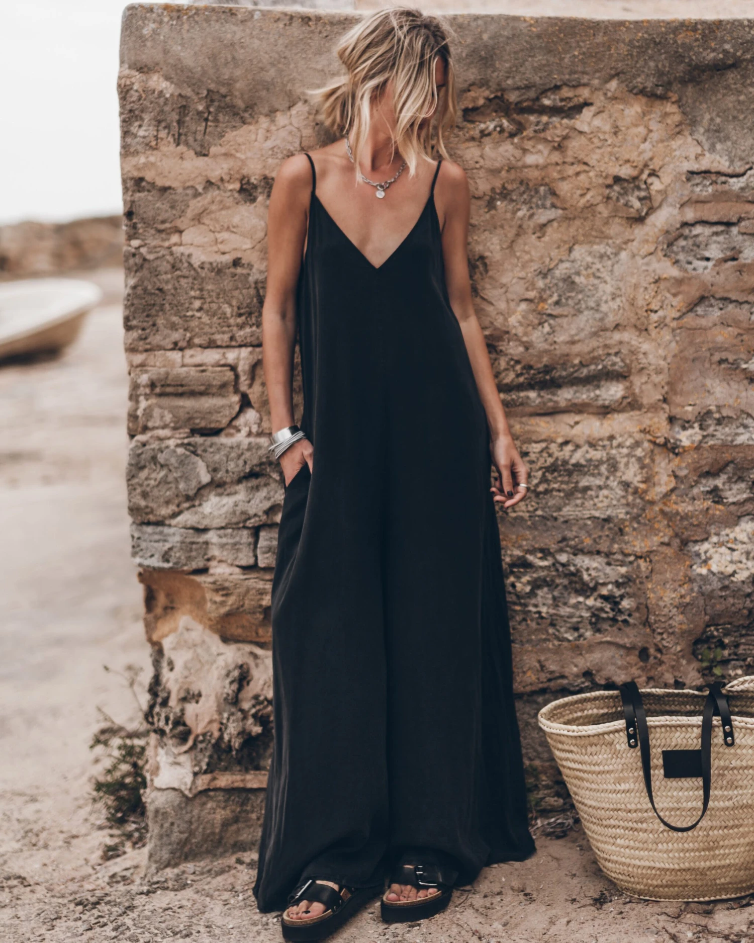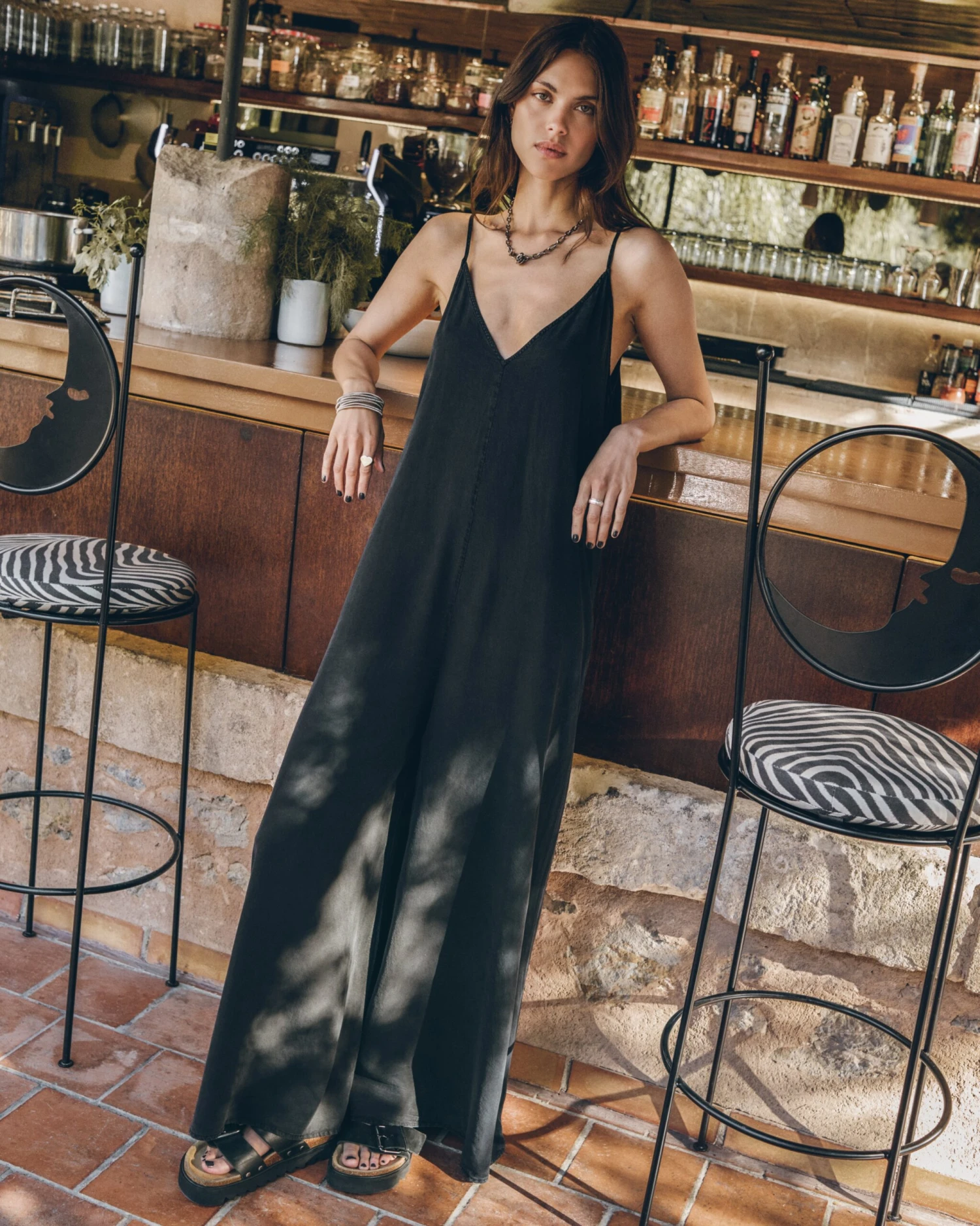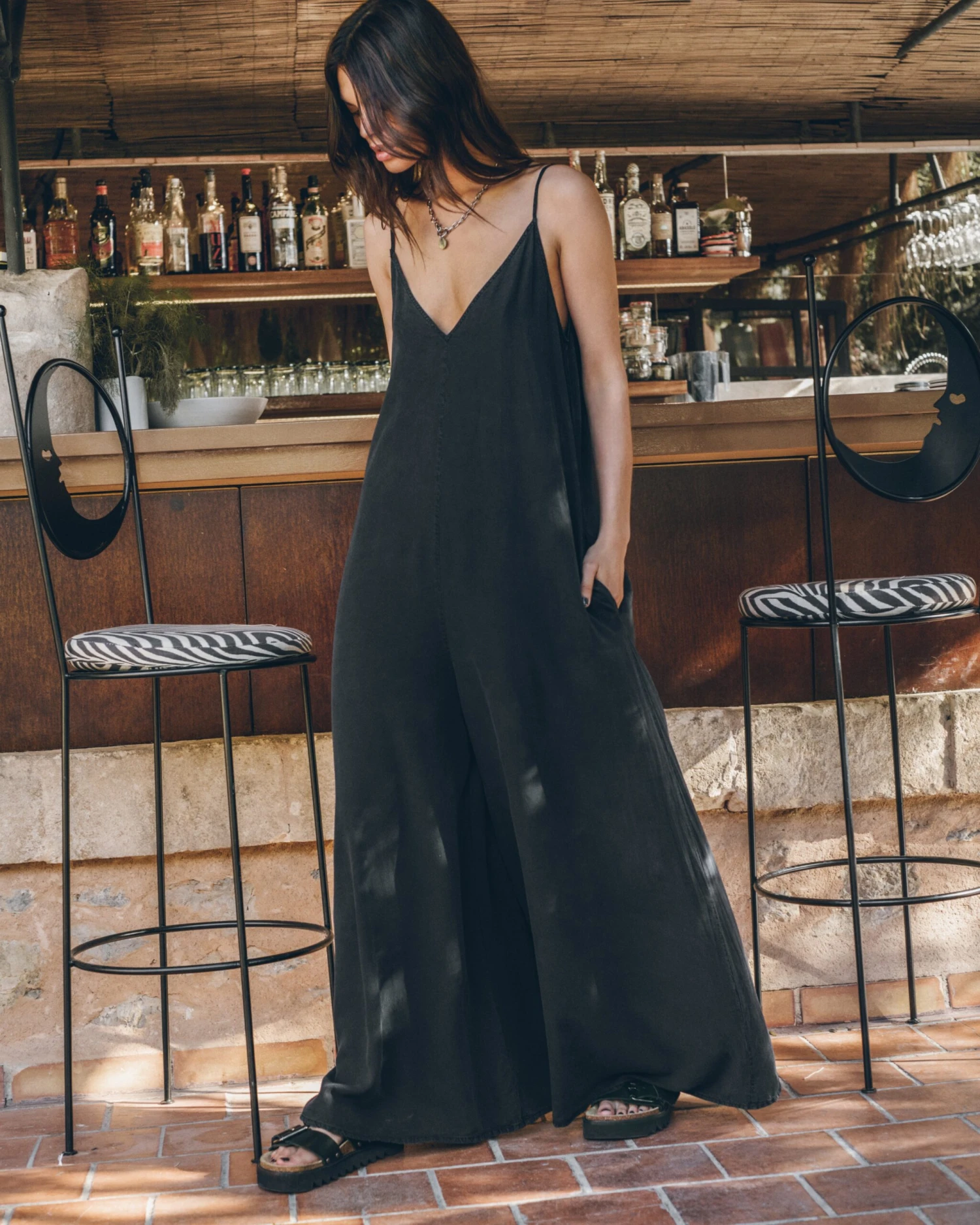 This 100% lyocell jumpsuit’s ultra wide leg design makes it an oversized delight, particularly from the waist down. Features a v-neck front and back and adjustable fine straps.