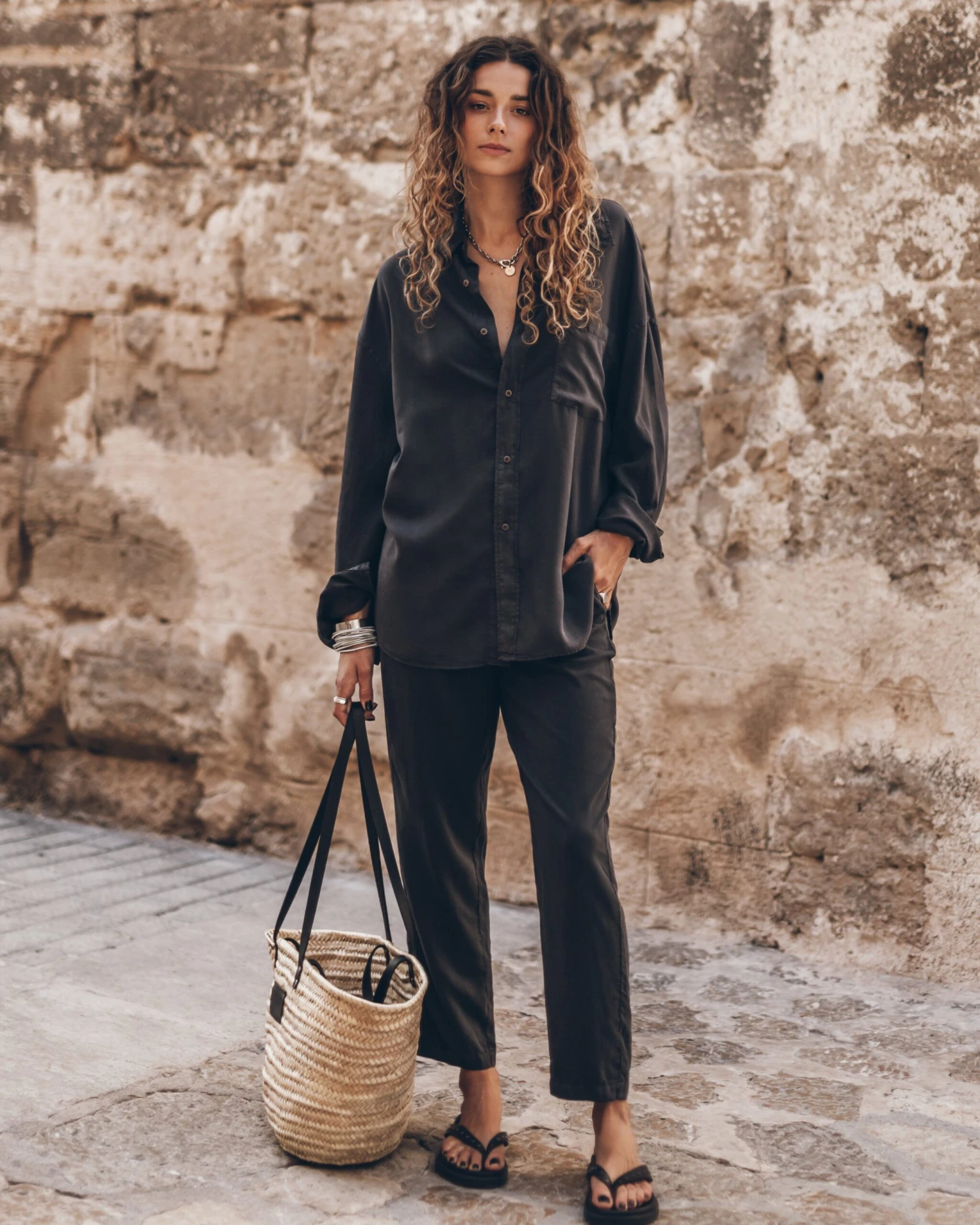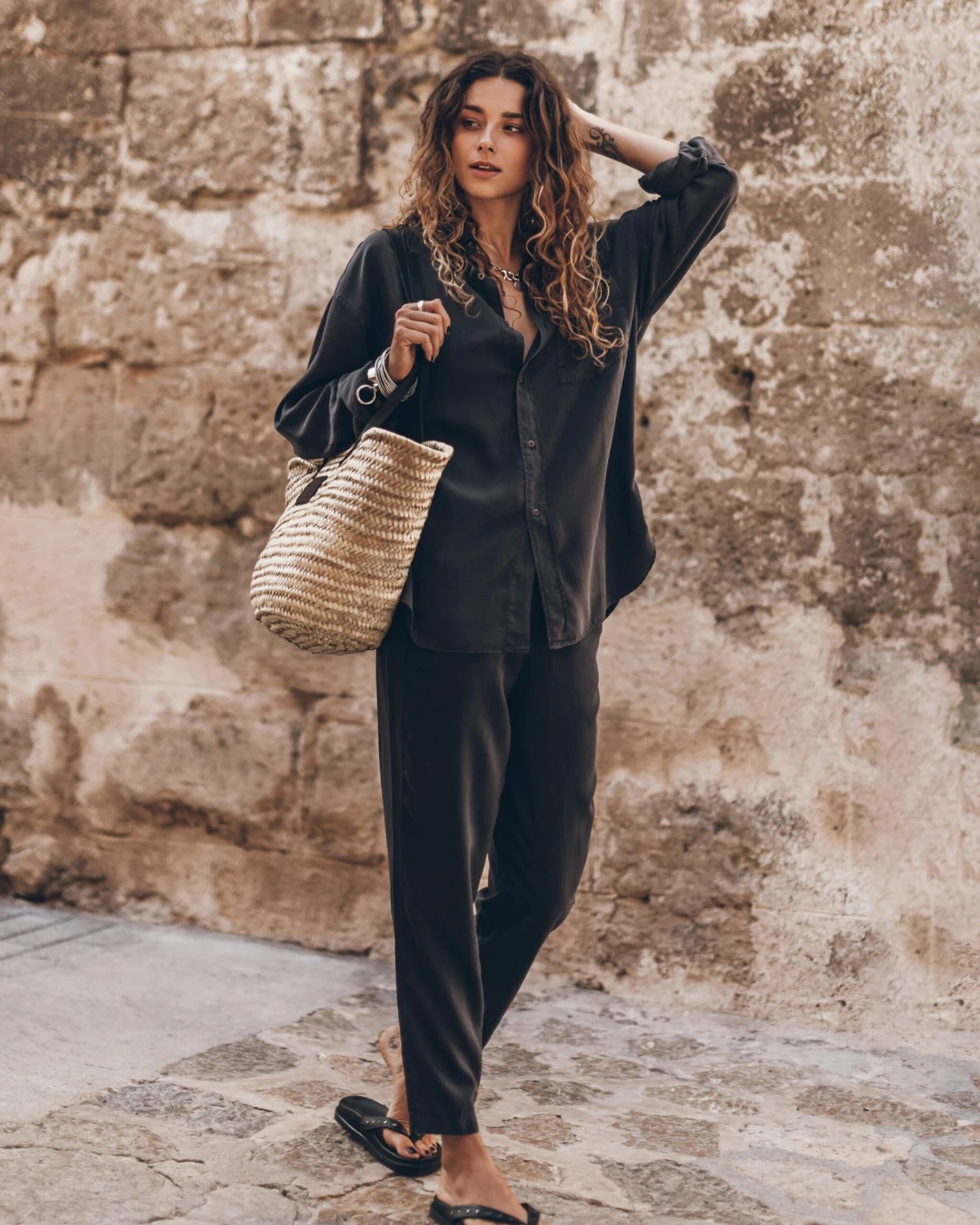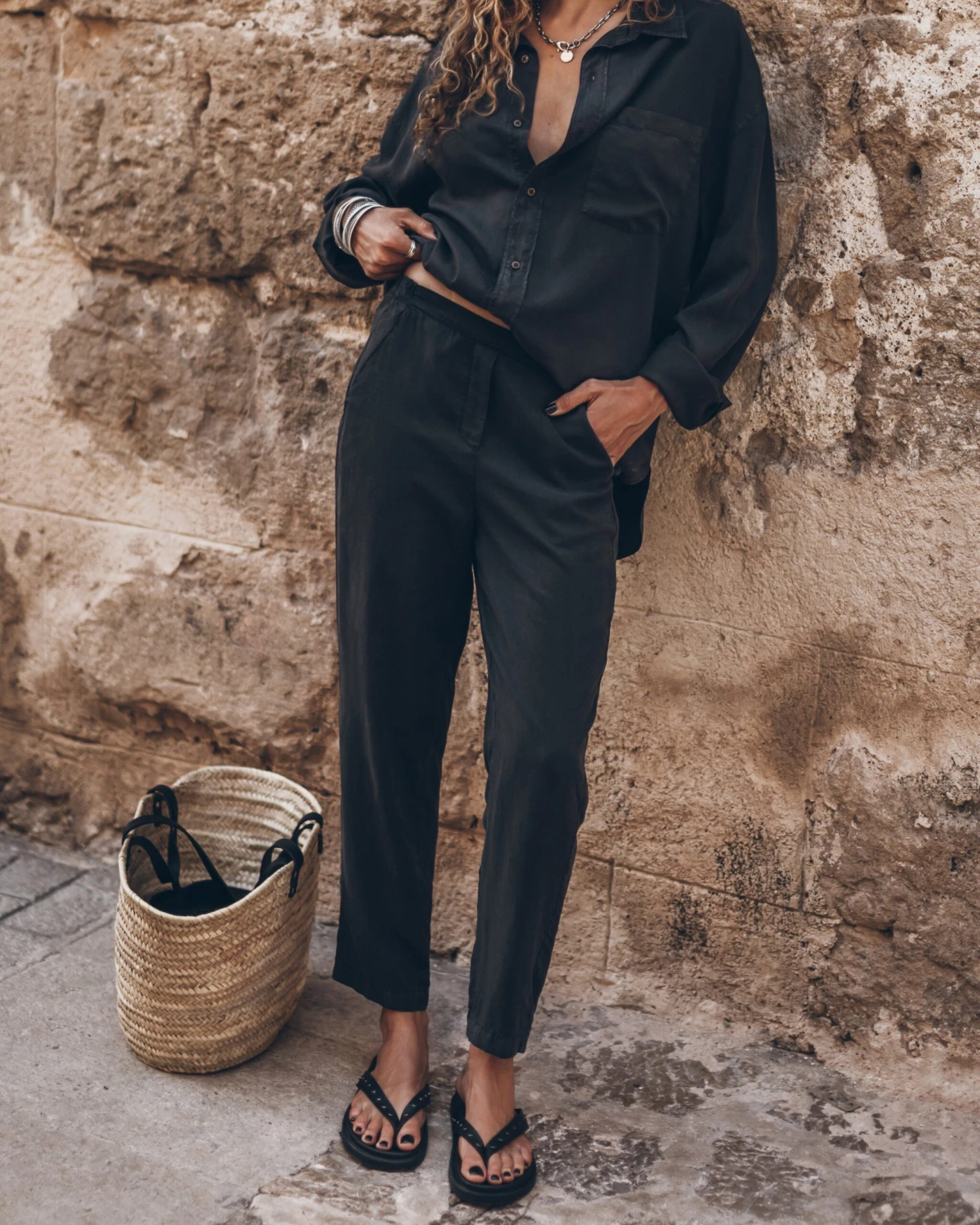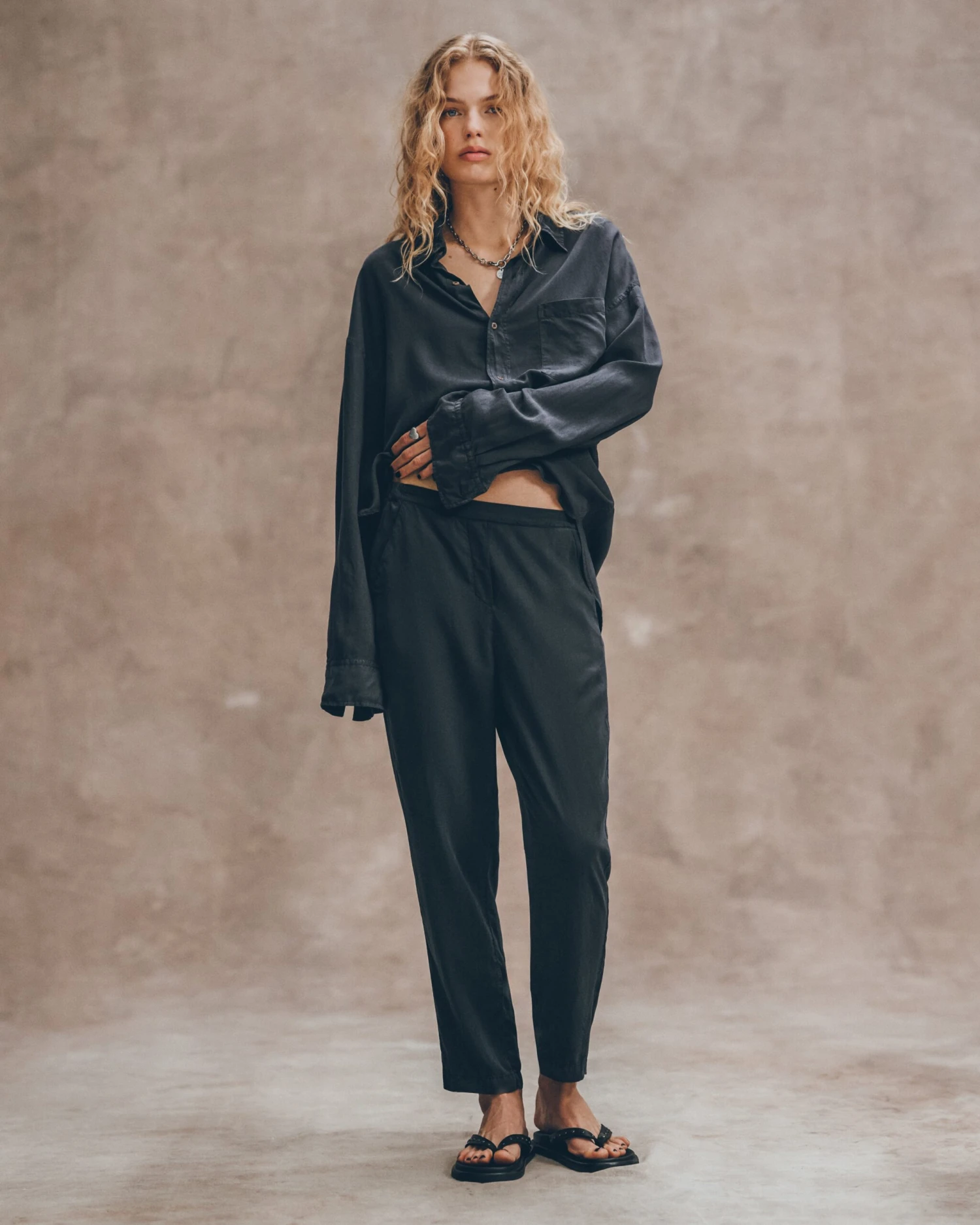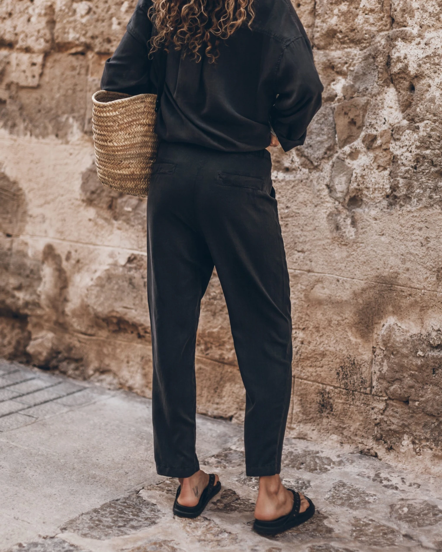 Soft and comfy lyocell pants in faded black. Stretchy waist with pockets on the sides.