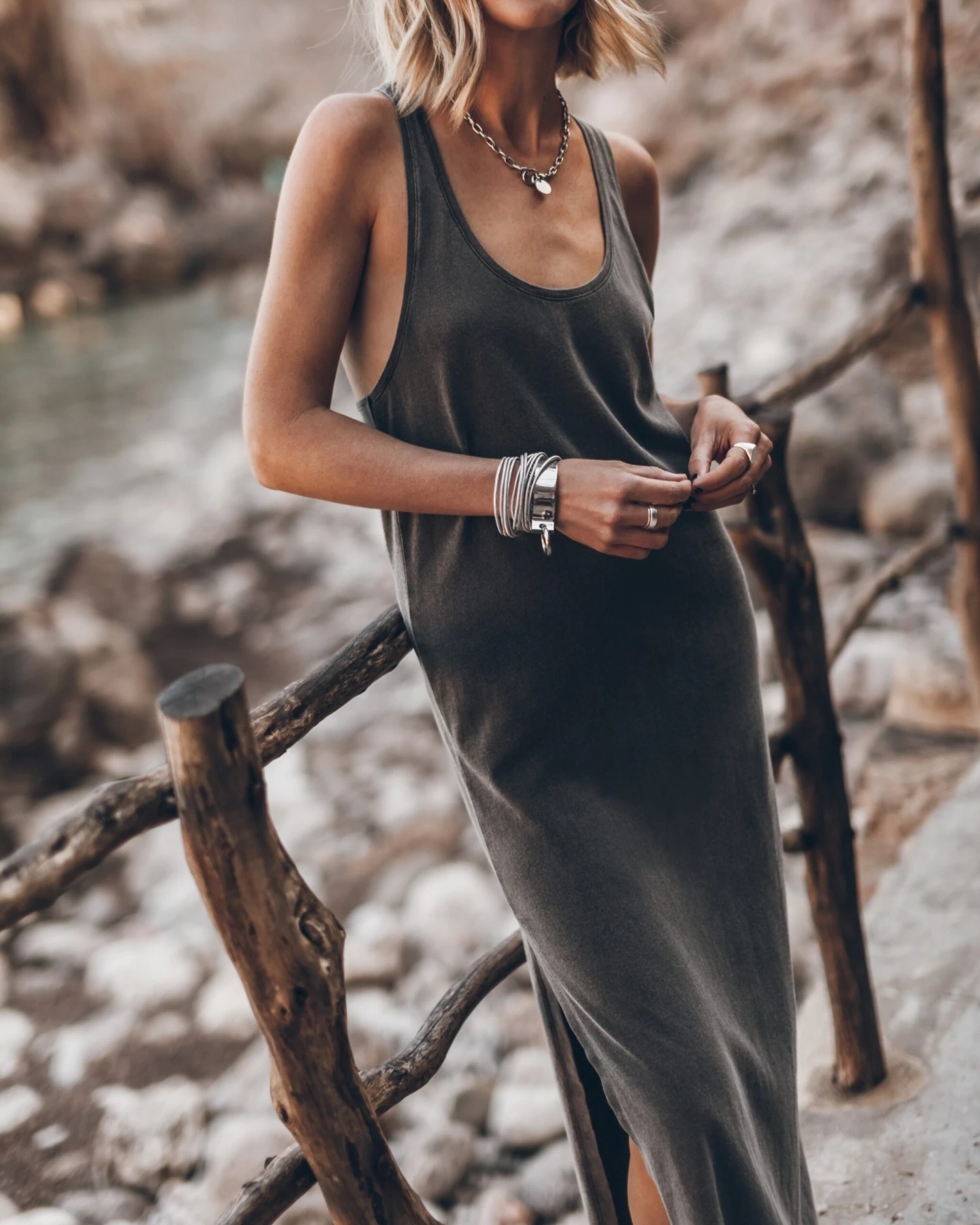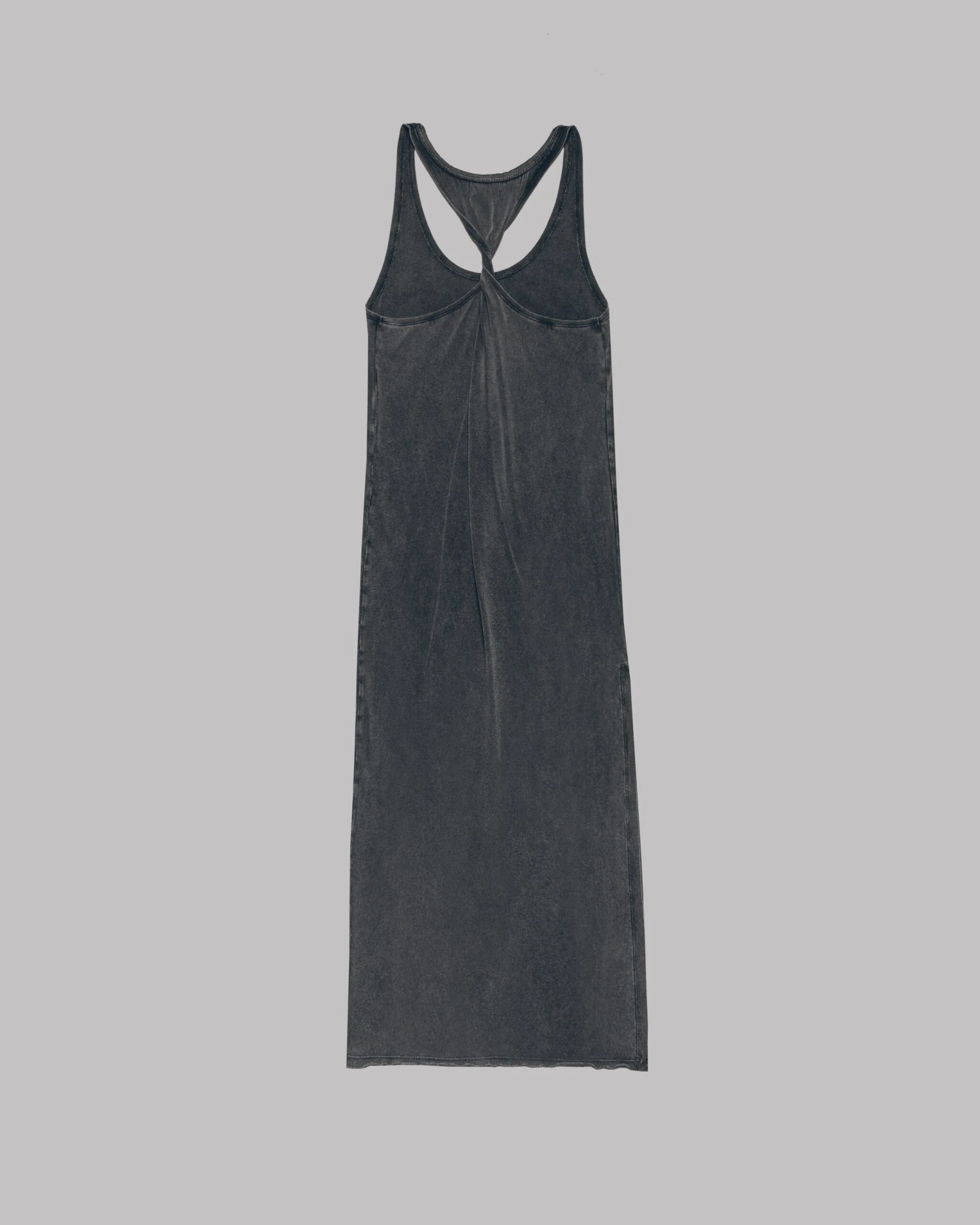 Long cotton tank dress in extra faded black with a twisted back. The dress has a vintage look with distressed details on the neck and a slit on the side.
