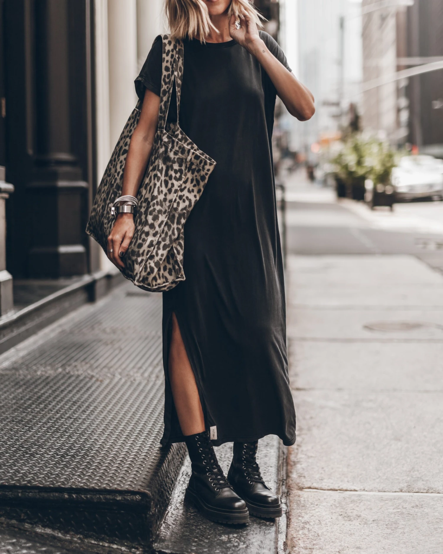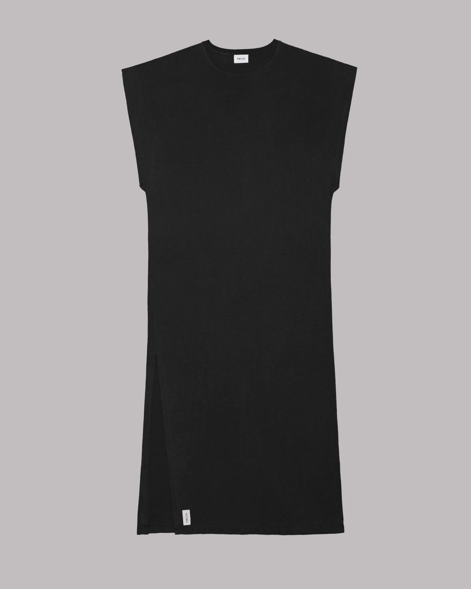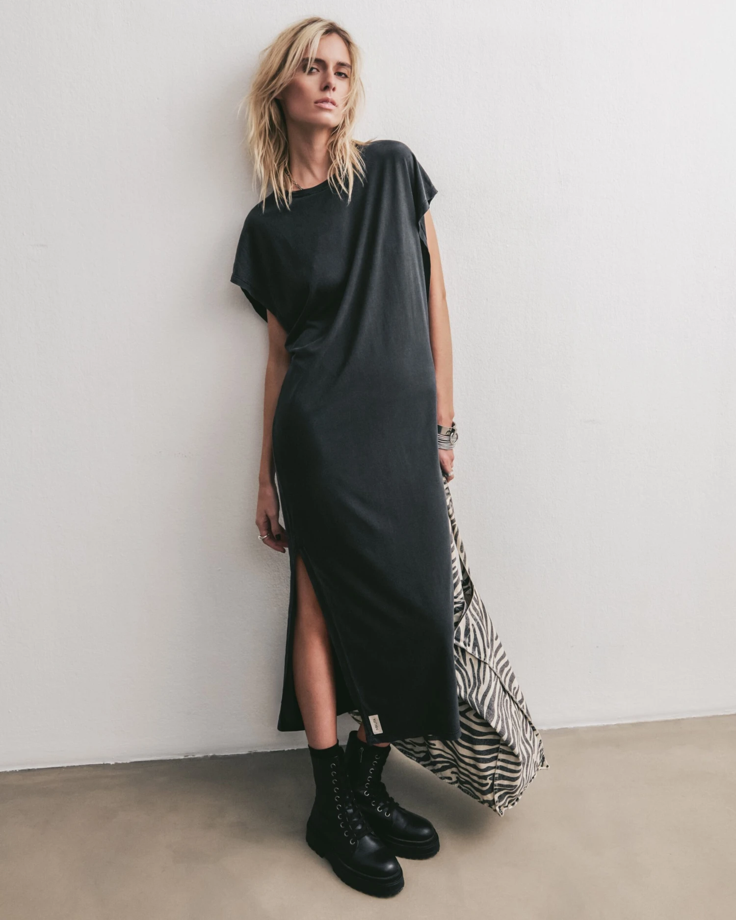 Long T-shirt dress in faded black with open sleeves and slit on the side for extra air and peek-a-boo! Simple and effortless with a twist!