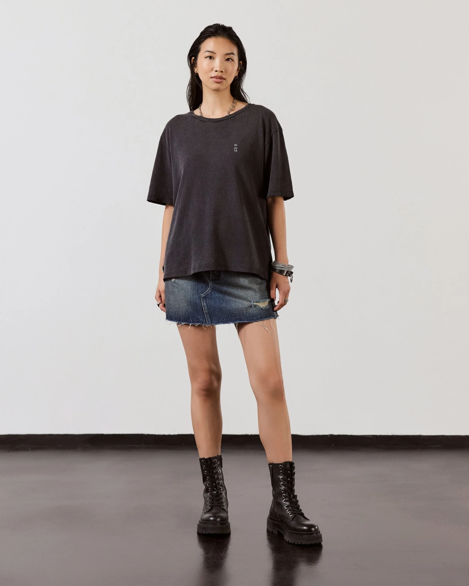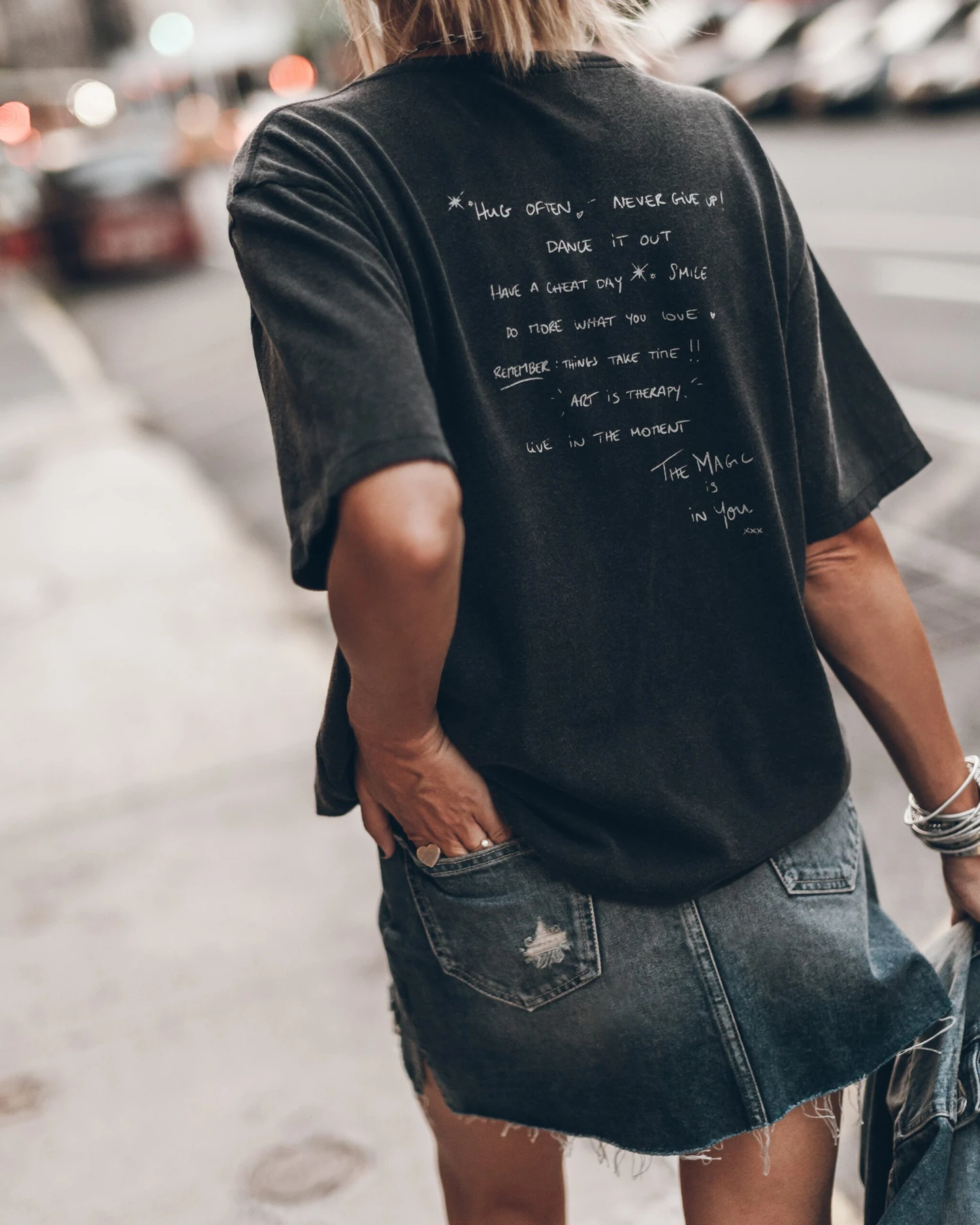 Vintage inspired cotton t-shirt in faded black with handwritten self love note on the back and handwritten logo on the chest. Comes with distressed collar and sleeves.