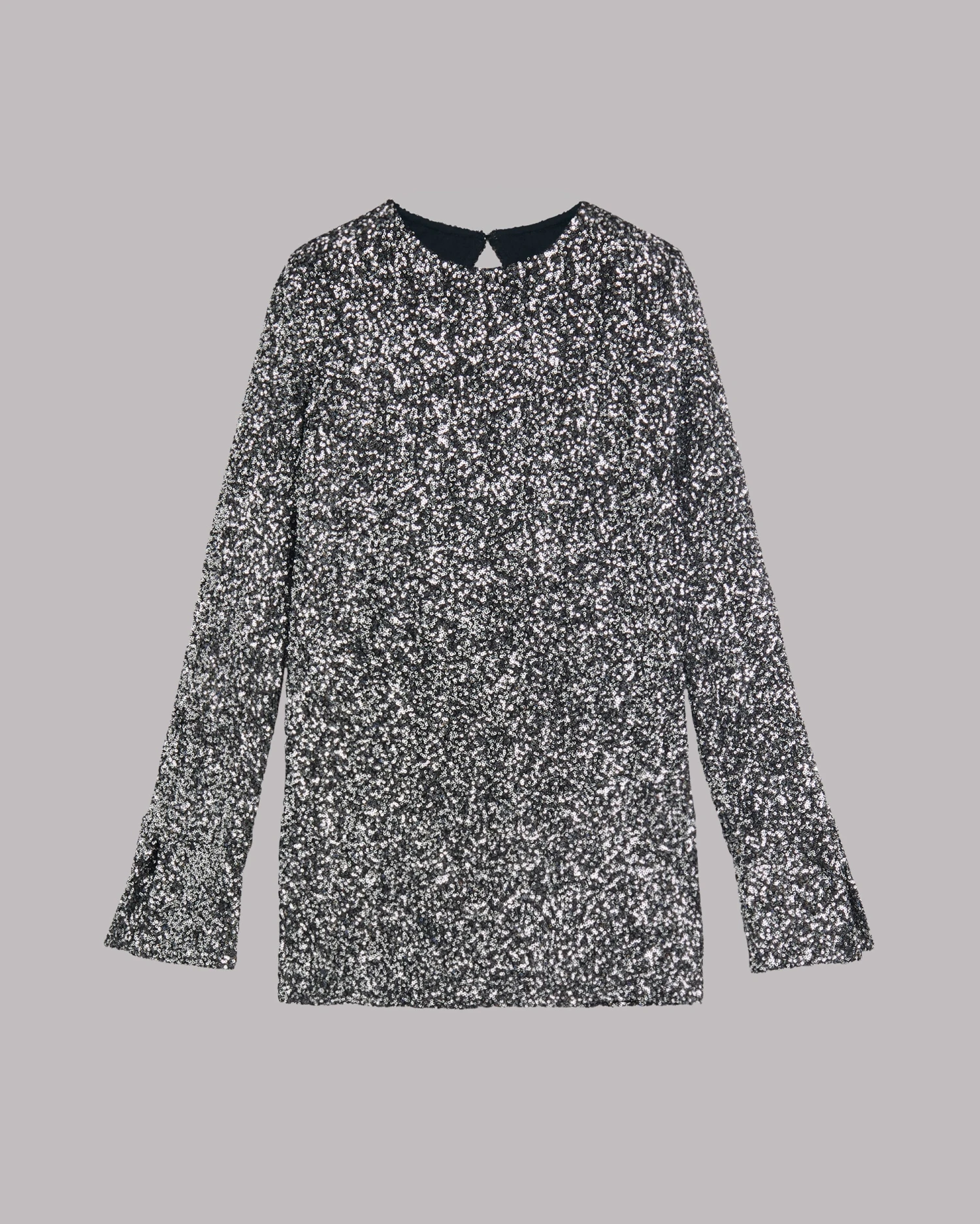 Dark silver sequin dress with open back and extra long sleeves with slits.