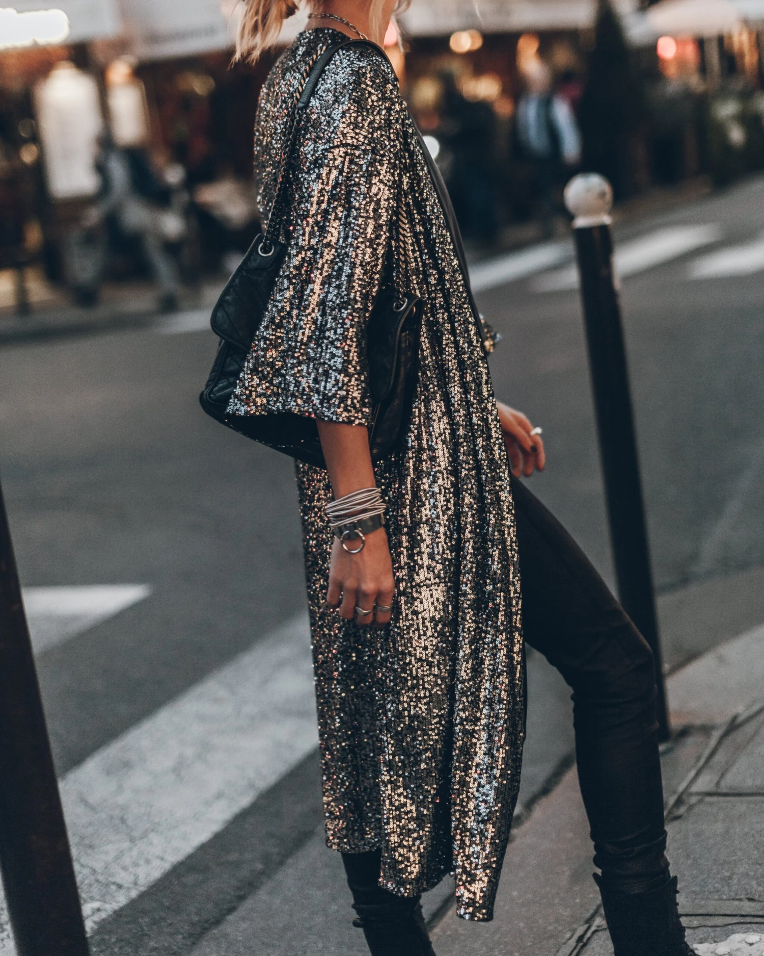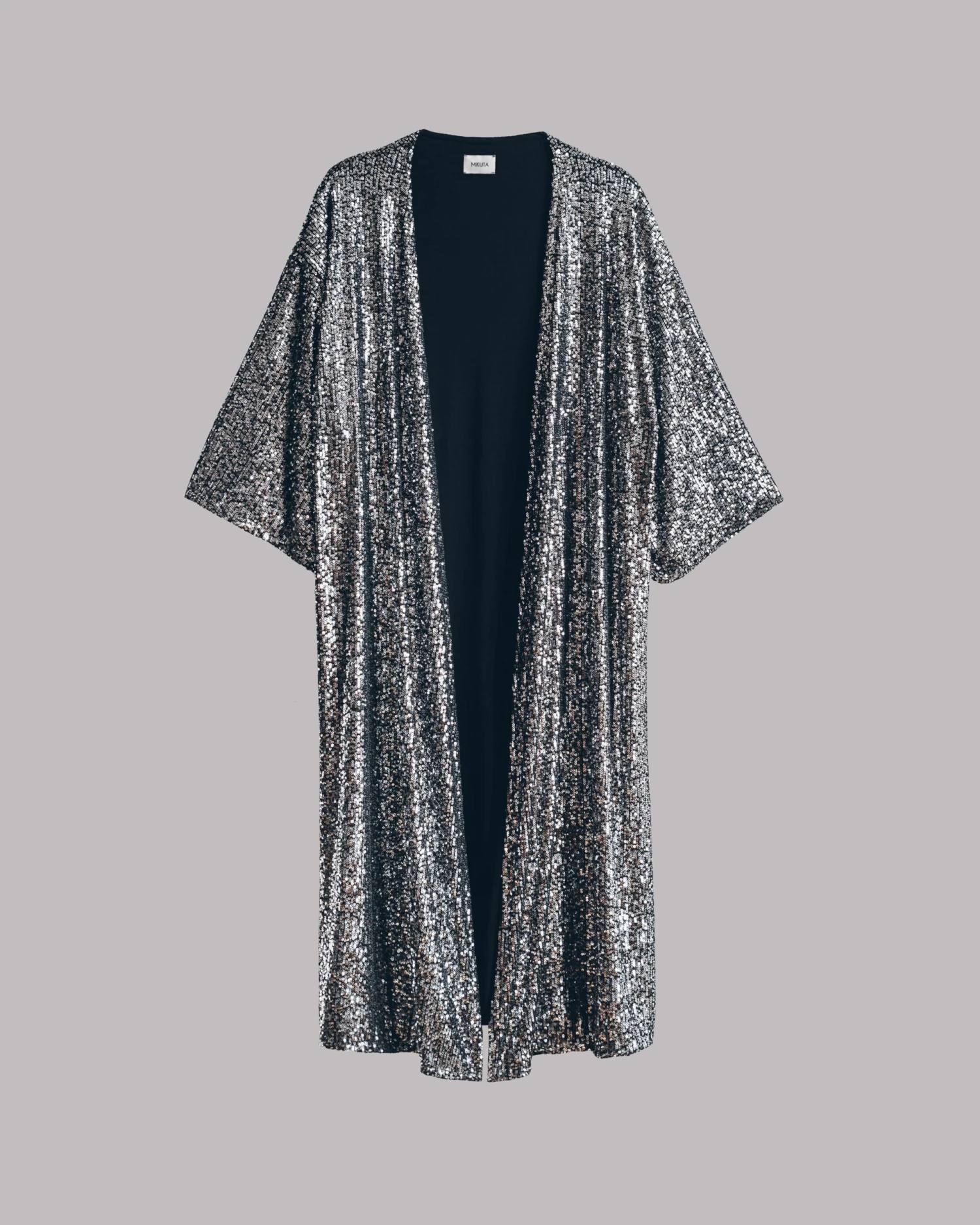 The glitter kimono is full of silver sequins sewn on black for that dark gun metal look, on the inside is a soft and comfortable viscose lining.