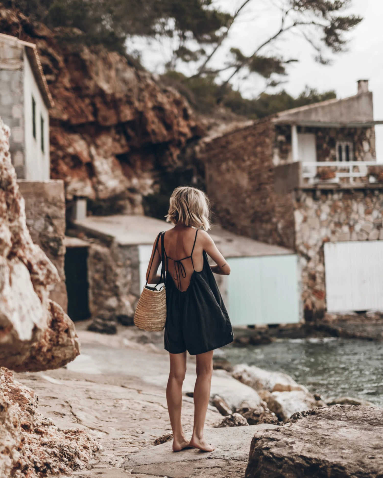 Short and flowy jumpsuit in faded black with hidden pockets on the sides, low back and ruffle details on the upper front and back.