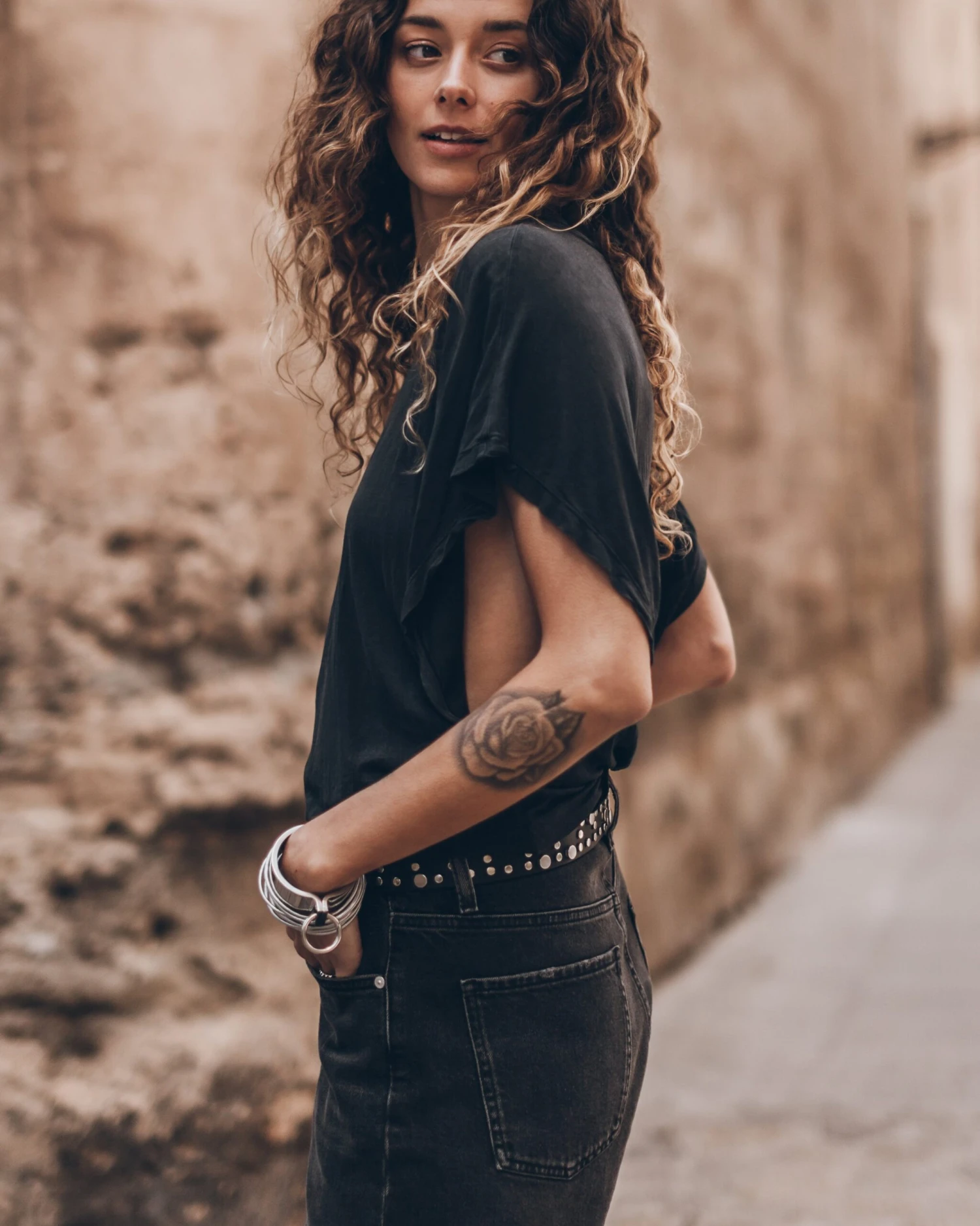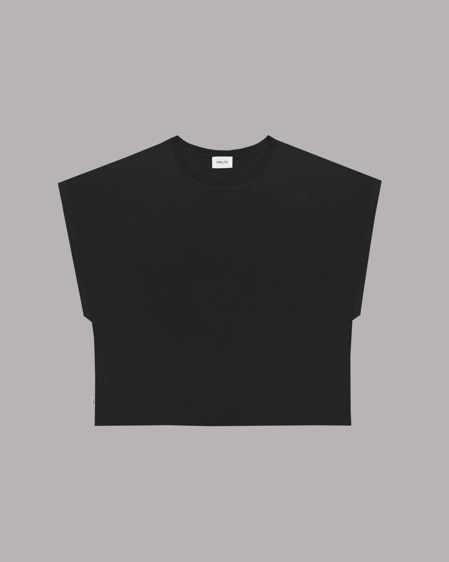 Charcoal batwing T-shirt in light lyocell & cotton-mix. Open sleeves and semi-cropped fit.