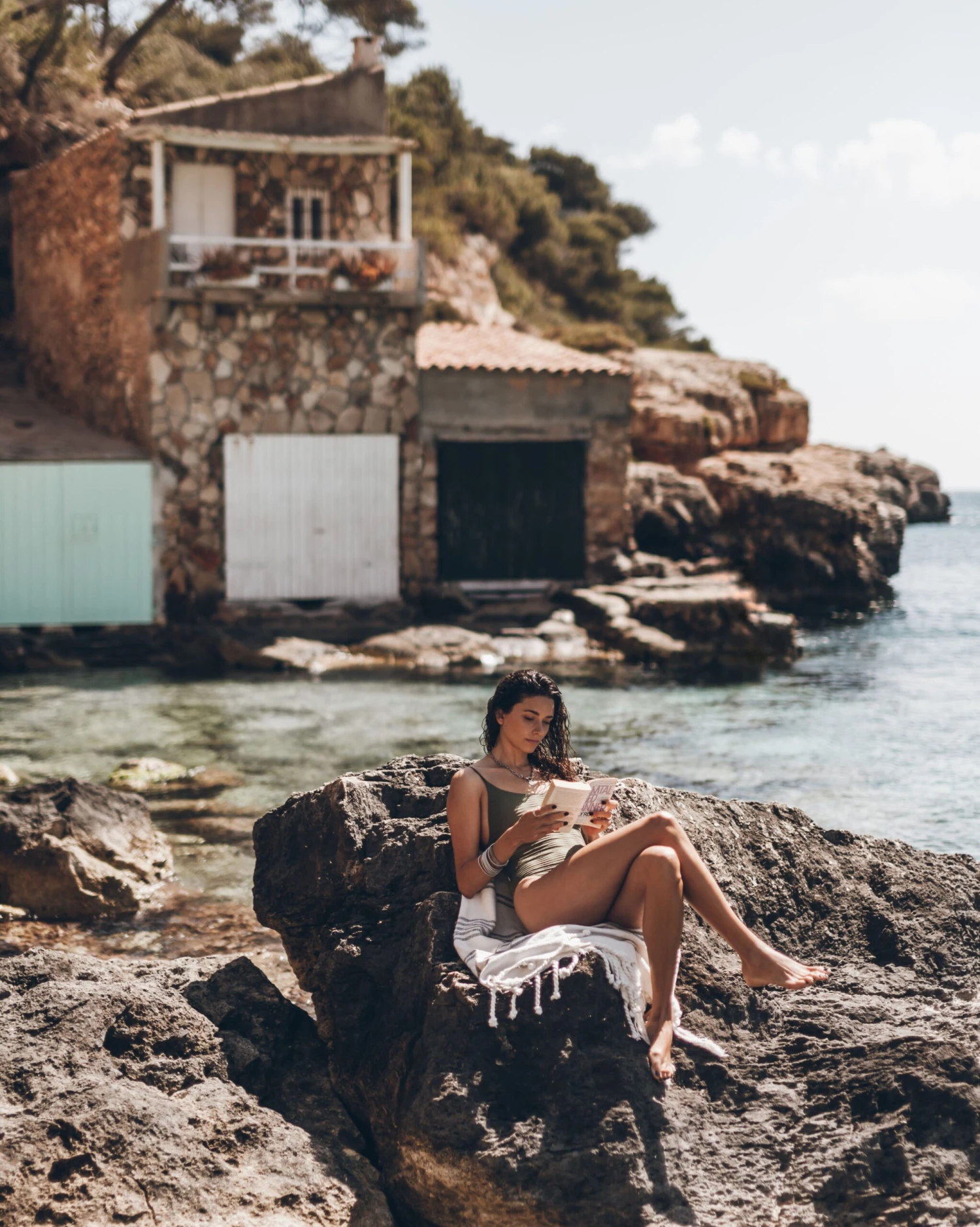 Green structured swimsuit with low back and adjustable shoulder straps.