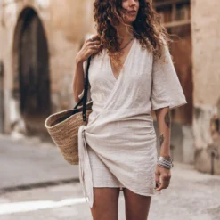 Easy breezy wrap dress in light beige/ grey, made of cotton gauze. The dress has double layers on the back and in front under the waist and is being knotted on the side.