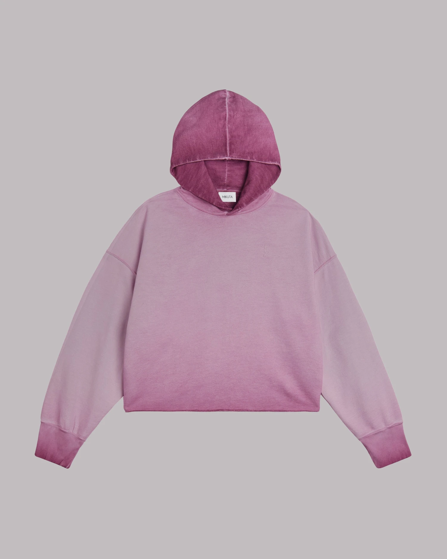 Cropped hoodie in faded pink with raw hem. The hoodie has a darker pink on the hoodie and sleeves and an embroidered MIKUTA logo on the chest.
