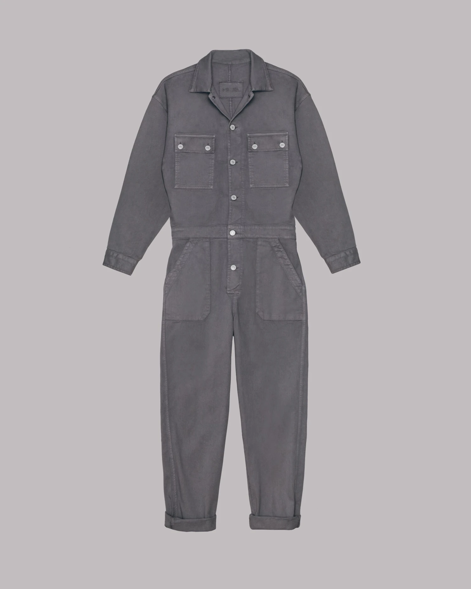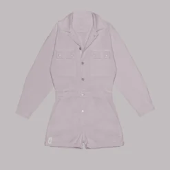 Cotton jumpsuit in stone grey with summary opening on the front. Comes with two side pockets, a pocket on the back and two chest pockets with summarys.