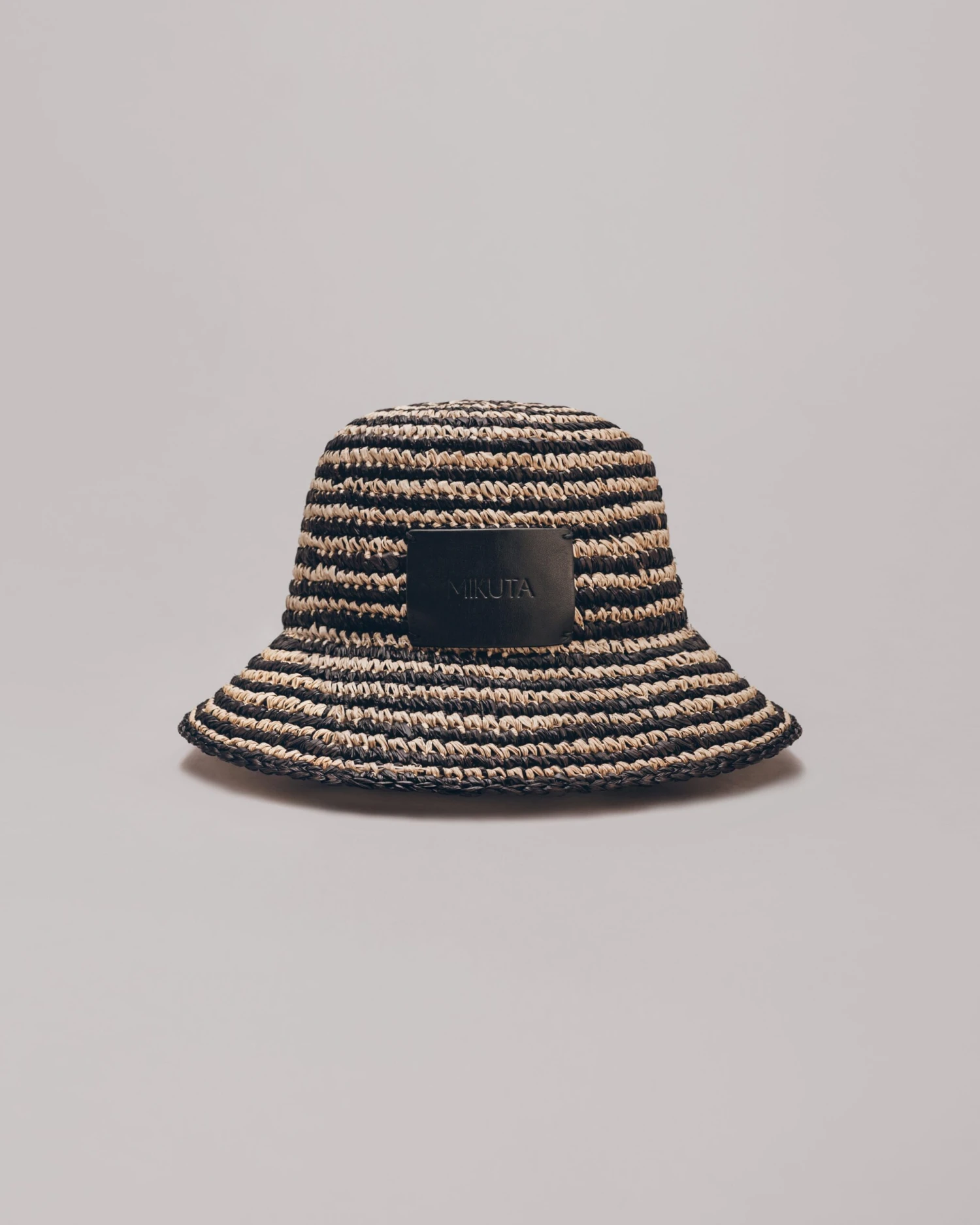 Natural and black striped raffia bucket hat with a black leather logo patch.