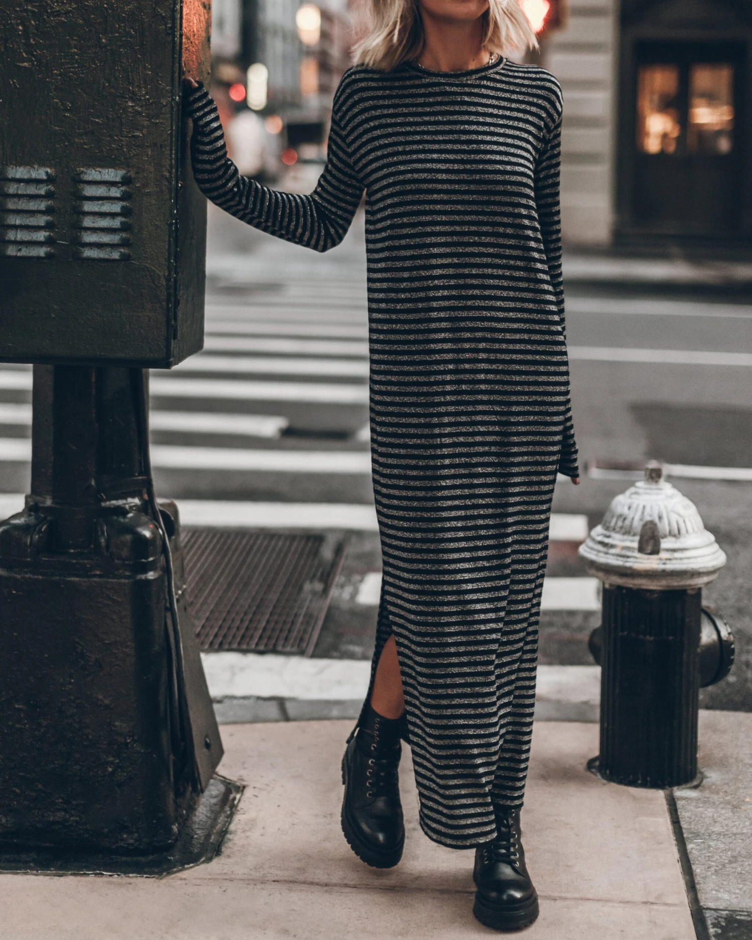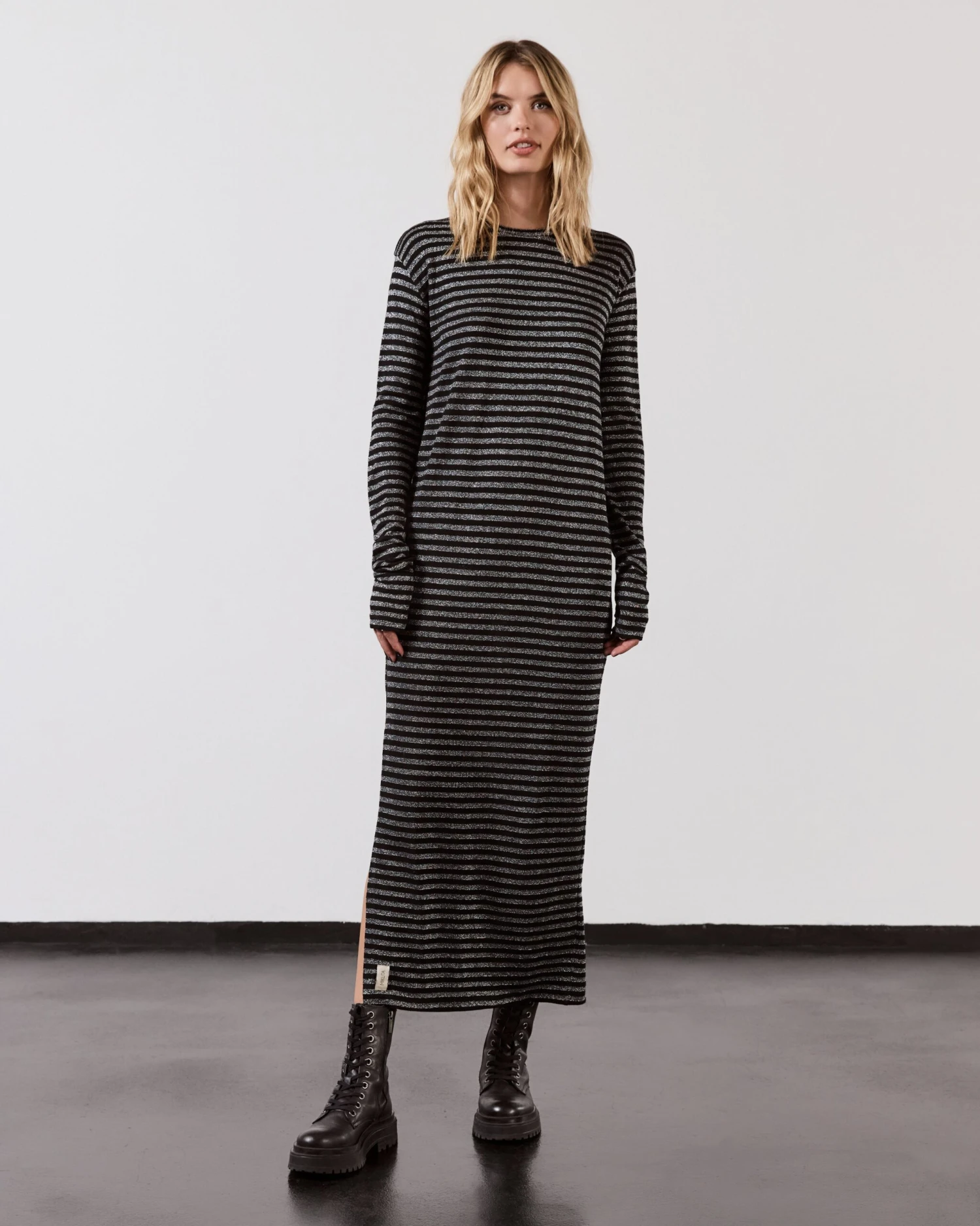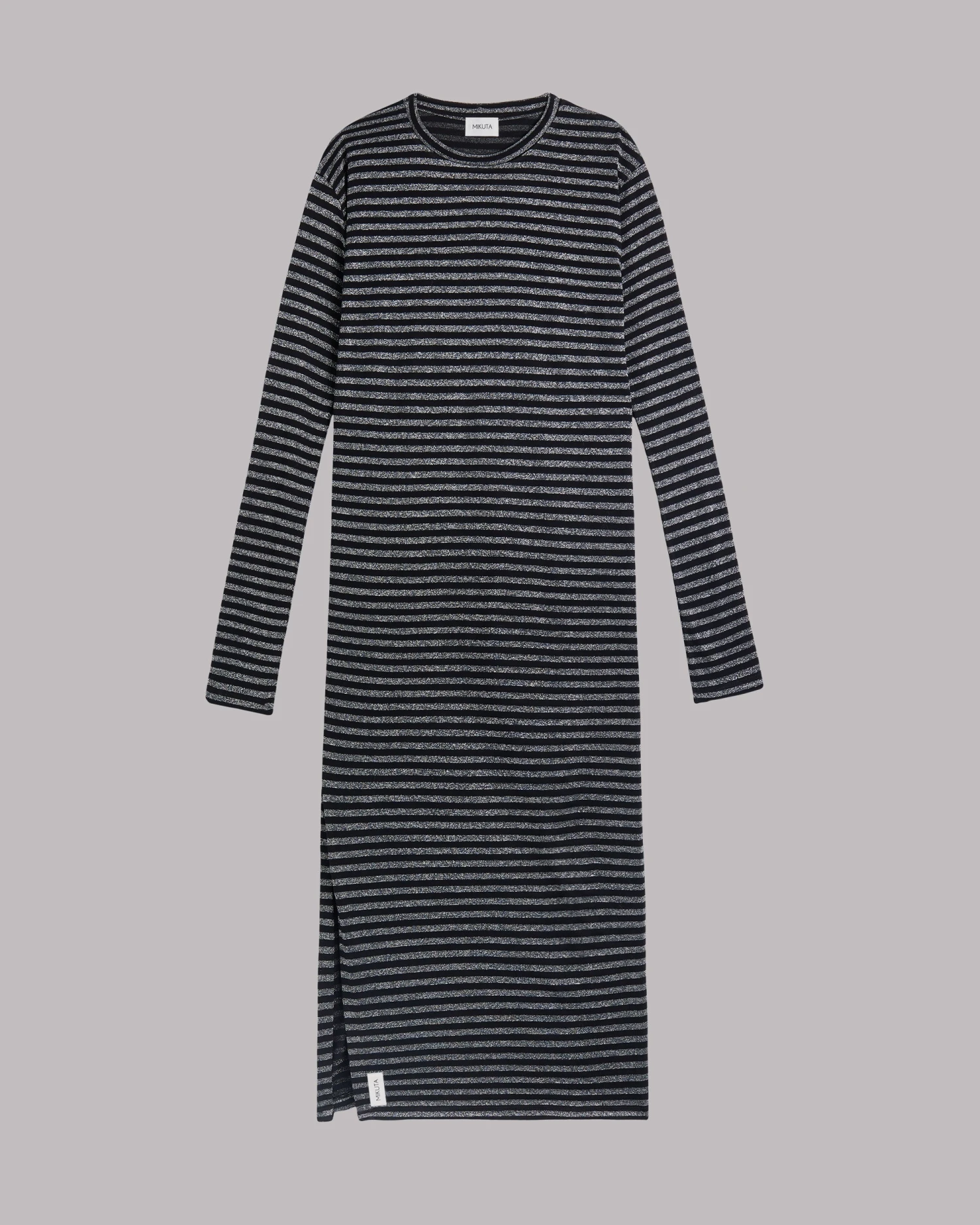 Striped long-sleeved dress in black and silver with extra long sleeves and a slit on the side.