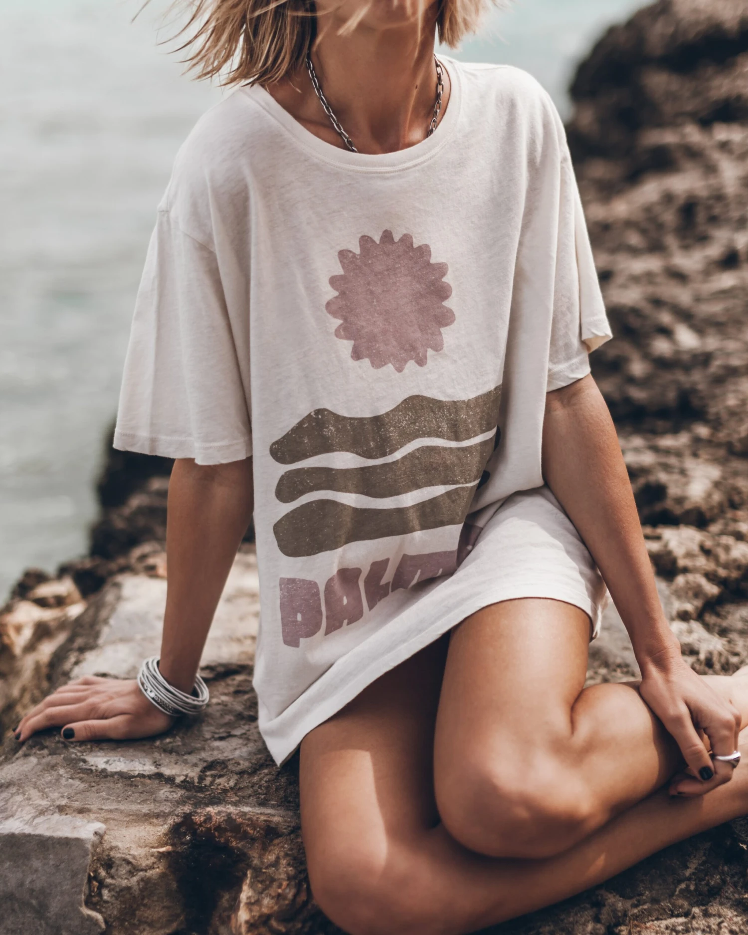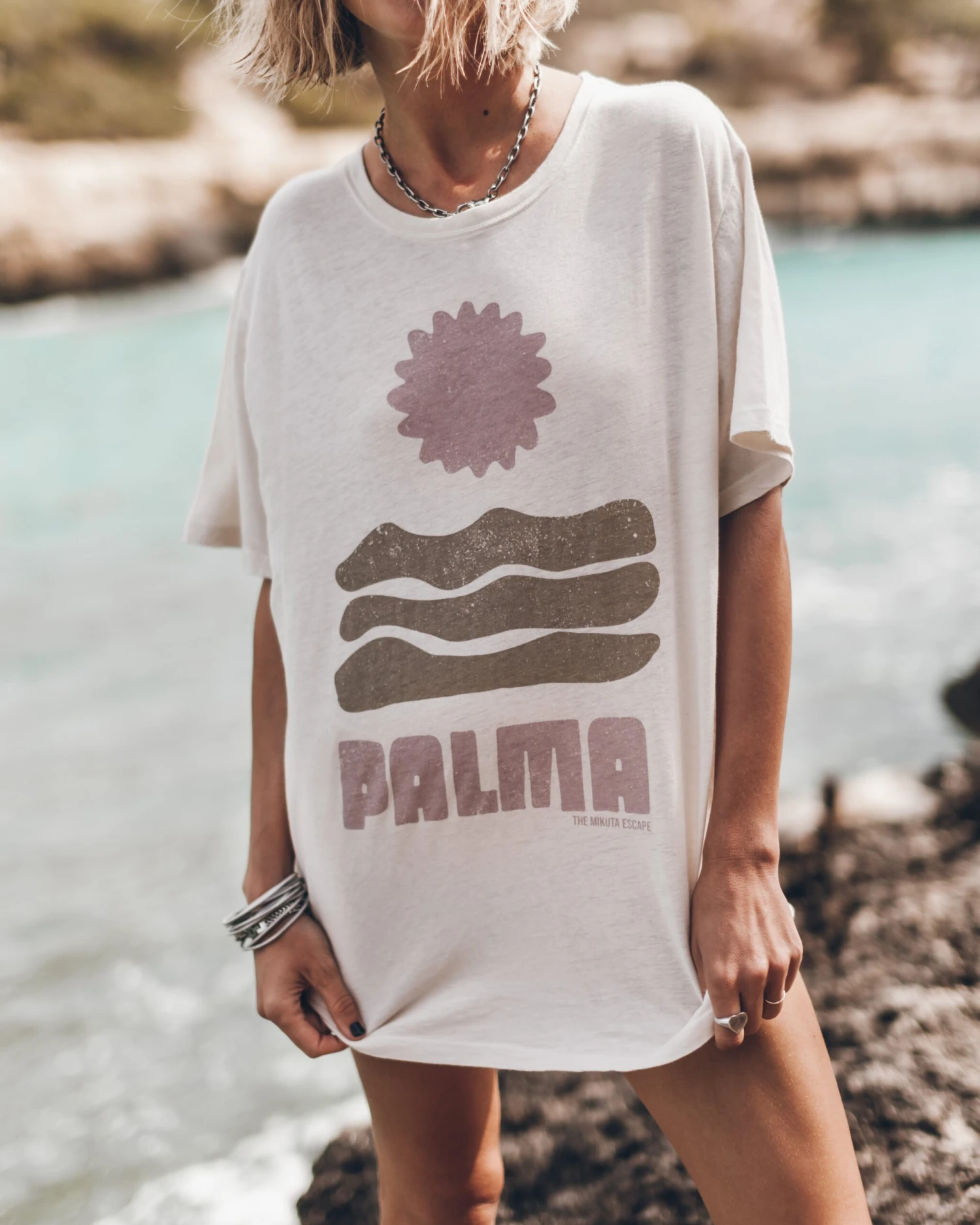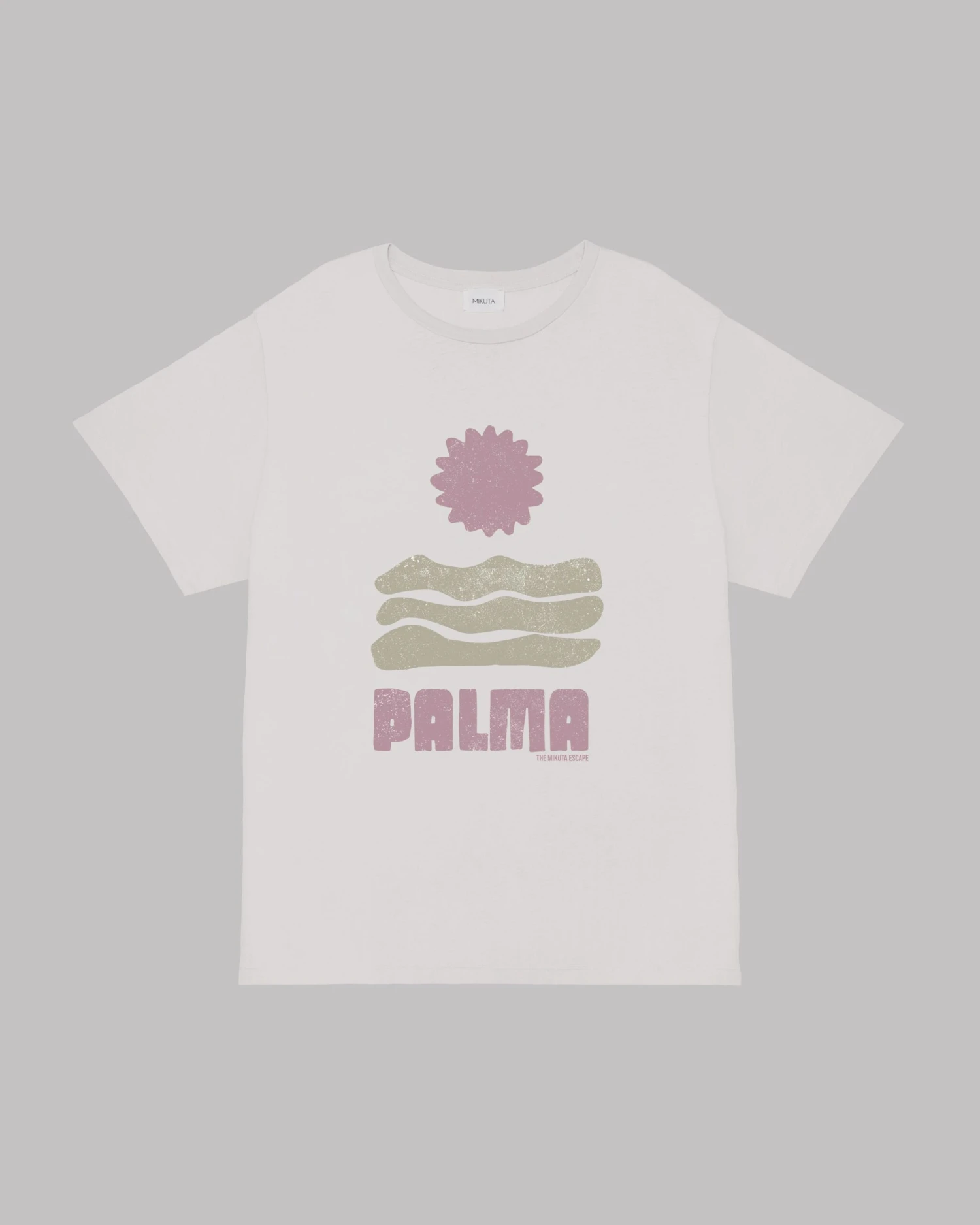 Oversized cotton T-shirt in off white with a pink and beige PALMA print.